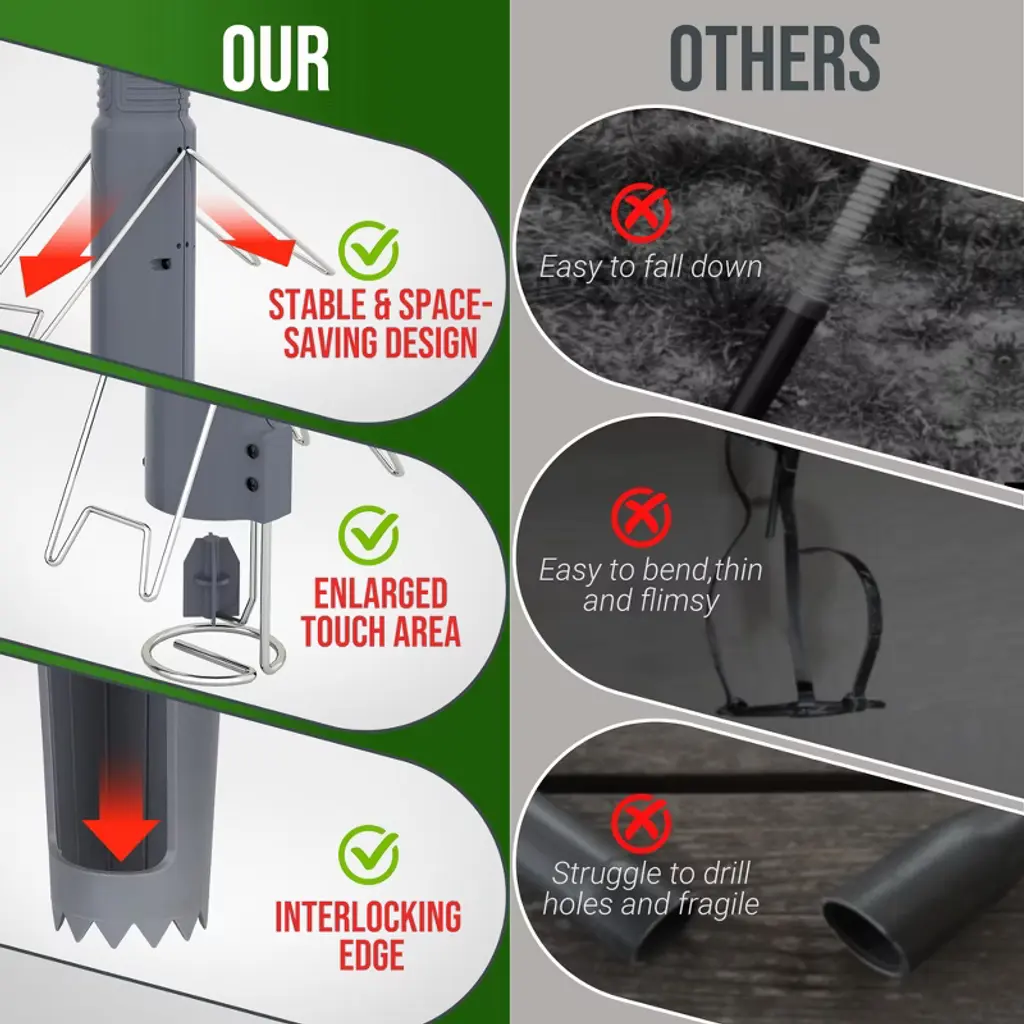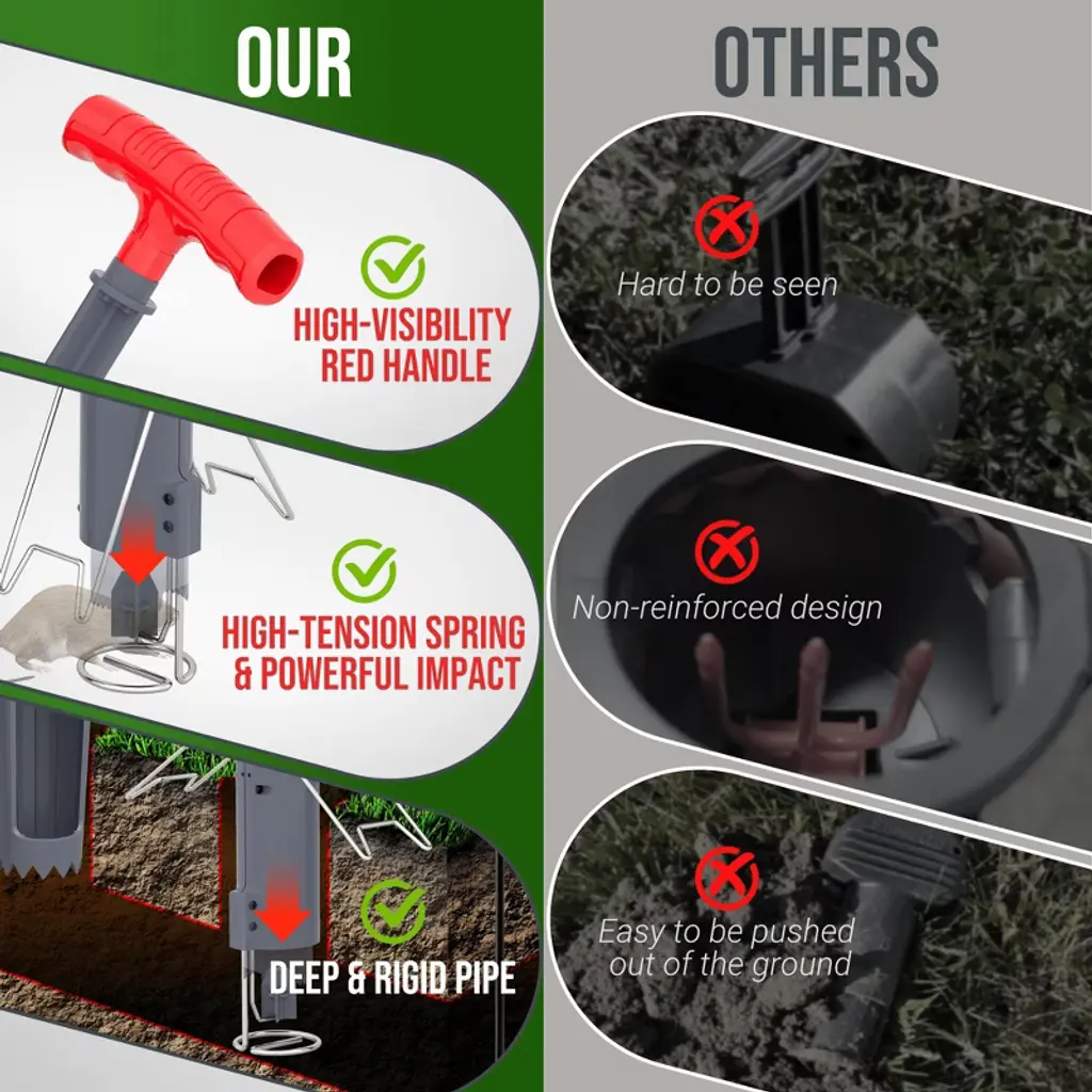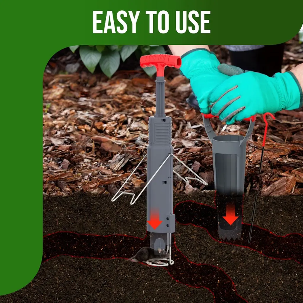 Easy Setup & Effective Trapping Locate the tunnel quickly using the included probe, then cut a clean vertical hole with the hole cutter. Simply insert the trap, extend the spring handle until it locks, and adjust the angle for optimal placement. For shallow tunnels, use the support bracket to keep the trap steady—ready to catch pests in seconds. Durable & Weatherproof Construction Built to last, this trap features sturdy plastic and rust-resistant stainless steel, making it ideal for outdoor use in lawns, gardens, and farms. The kit includes a digger, probe, and stand for precise tunnel targeting, easy soil removal, and stable placement—no tipping or misfires. Highly Sensitive, Yet Avoids False Triggers The enlarged trigger plate reacts instantly to mole movement but ignores loose dirt, thanks to its precision threshold. Paired with a high-tension spring and reinforced striking mechanism, it delivers a swift, humane capture with a near-perfect success rate. Smarter Design for Better Results Unlike bulky traps, our one-sided support design minimizes tunnel obstruction. Moles pass freely until activating the trigger—no suspicion, no escape. No bait required, just strategic placement for consistent catches. Versatile & Humane Pest Control Works effortlessly on gophers, voles, and moles. The push-pull mechanism ensures powerful spring action, while the capture indicator lets you check results at a glance. Perfect for homeowners and pros alike—reclaim your yard the easy way!