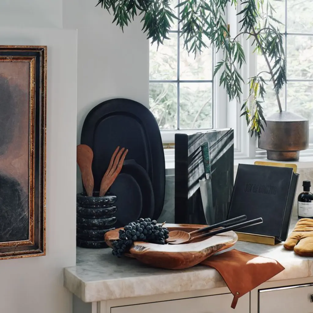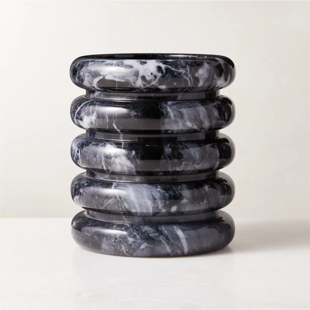 Sculpted tiers of black marble make a striking silhouette for kitchen utensils. Polished black marble with subtle swirls of white activity will vary from piece to piece, making each naturally one of a kind. Works beautifully as a wine chiller as well. CB2 exclusive.