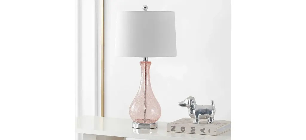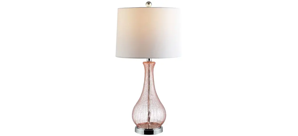Designed to update any living room, this contemporary Turner Table Lamp blends seamlessly into any d_cor. Its blush glass body reflects the light, ethereal glow filtered through its complimentary cotton barrel shade. Designers love its sleek chrome finish.