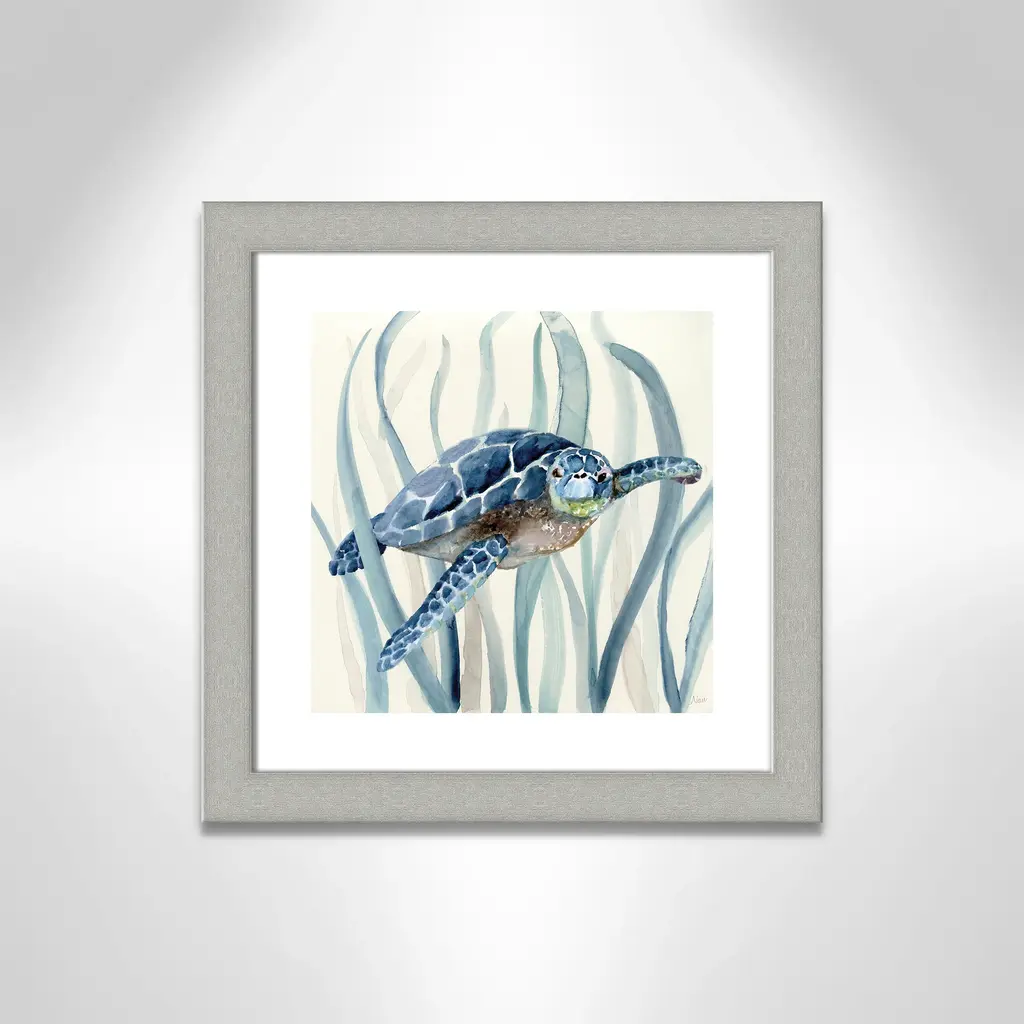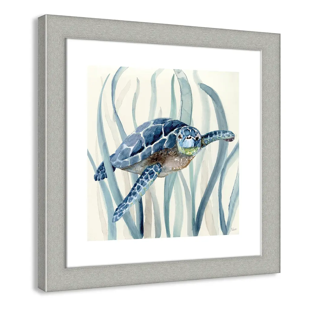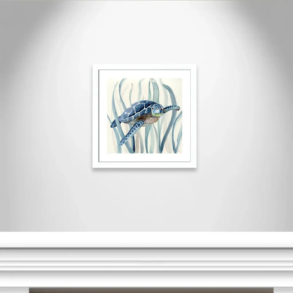 Turtle in Seagrass I', a fun and vibrant coastal sea life image of a turtle happily swimming through seagrass, will transform your home into a tropical getaway! This indigo masterpiece is the perfect pop of color for your coastal home décor. Finished in a modern frame made of PS materials, this is the perfect addition to your walls. Archival fine art giclée print on acid-free and lignin-free 100% cotton rag paper; image includes a bright white self-matting border Printed with gallery-quality inks using the finest giclée print technology for unsurpassed color gamut and clarity Lightweight and finished under shatter-resistant acrylic; hanging hardware attached for easy and secure installation Handcrafted in the USA and ships with a Certificate of Authenticity Lightweight and finished under shatter-resistant acrylic