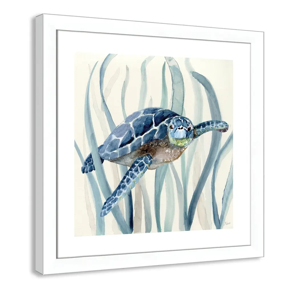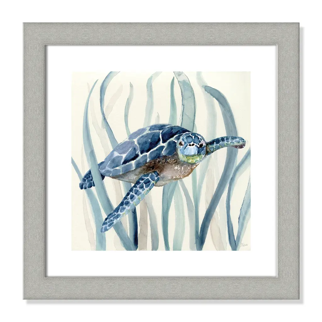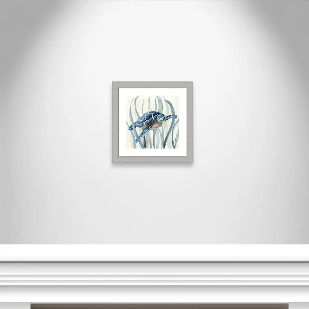 Turtle in Seagrass I', a fun and vibrant coastal sea life image of a turtle happily swimming through seagrass, will transform your home into a tropical getaway! This indigo masterpiece is the perfect pop of color for your coastal home décor. Finished in a modern frame made of PS materials, this is the perfect addition to your walls. Archival fine art giclée print on acid-free and lignin-free 100% cotton rag paper; image includes a bright white self-matting border Printed with gallery-quality inks using the finest giclée print technology for unsurpassed color gamut and clarity Lightweight and finished under shatter-resistant acrylic; hanging hardware attached for easy and secure installation Handcrafted in the USA and ships with a Certificate of Authenticity Lightweight and finished under shatter-resistant acrylic