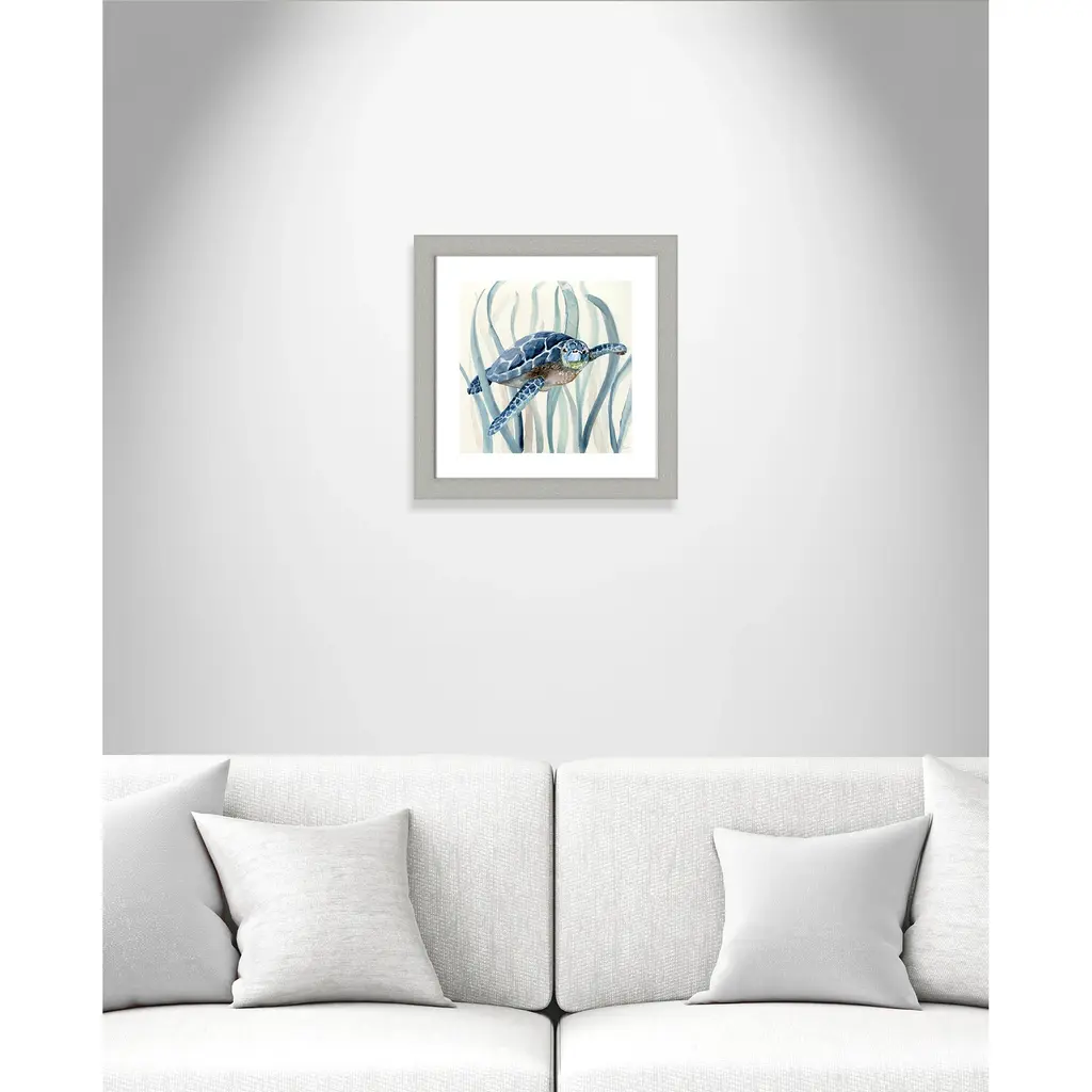Turtle in Seagrass I', a fun and vibrant coastal sea life image of a turtle happily swimming through seagrass, will transform your home into a tropical getaway! This indigo masterpiece is the perfect pop of color for your coastal home décor. Finished in a modern frame made of PS materials, this is the perfect addition to your walls. Archival fine art giclée print on acid-free and lignin-free 100% cotton rag paper; image includes a bright white self-matting border Printed with gallery-quality inks using the finest giclée print technology for unsurpassed color gamut and clarity Lightweight and finished under shatter-resistant acrylic; hanging hardware attached for easy and secure installation Handcrafted in the USA and ships with a Certificate of Authenticity Lightweight and finished under shatter-resistant acrylic