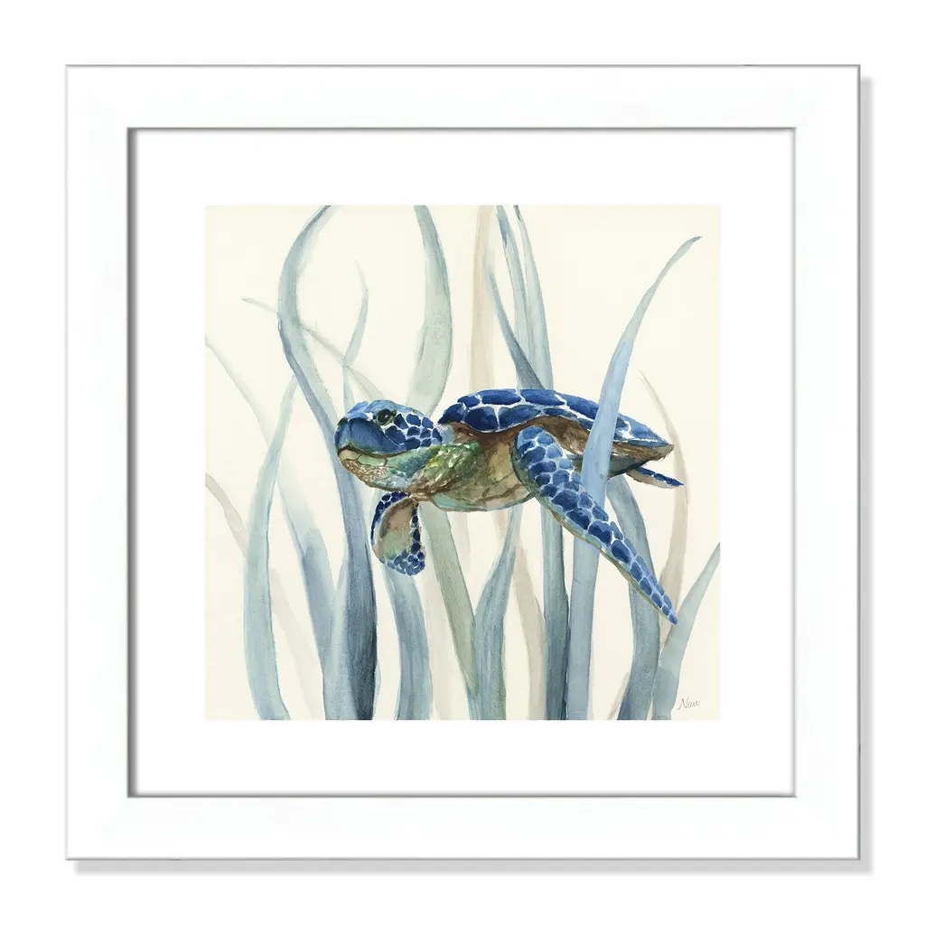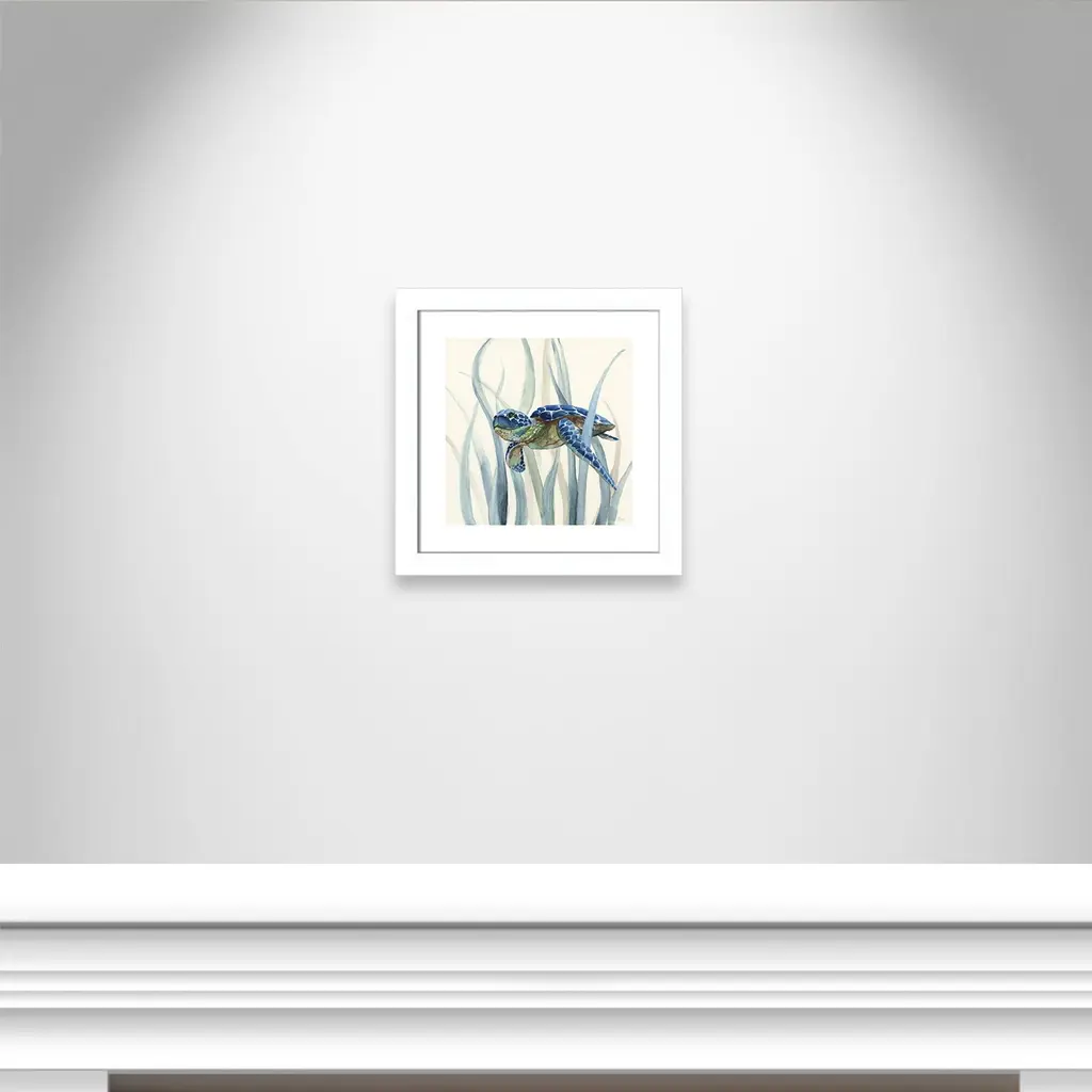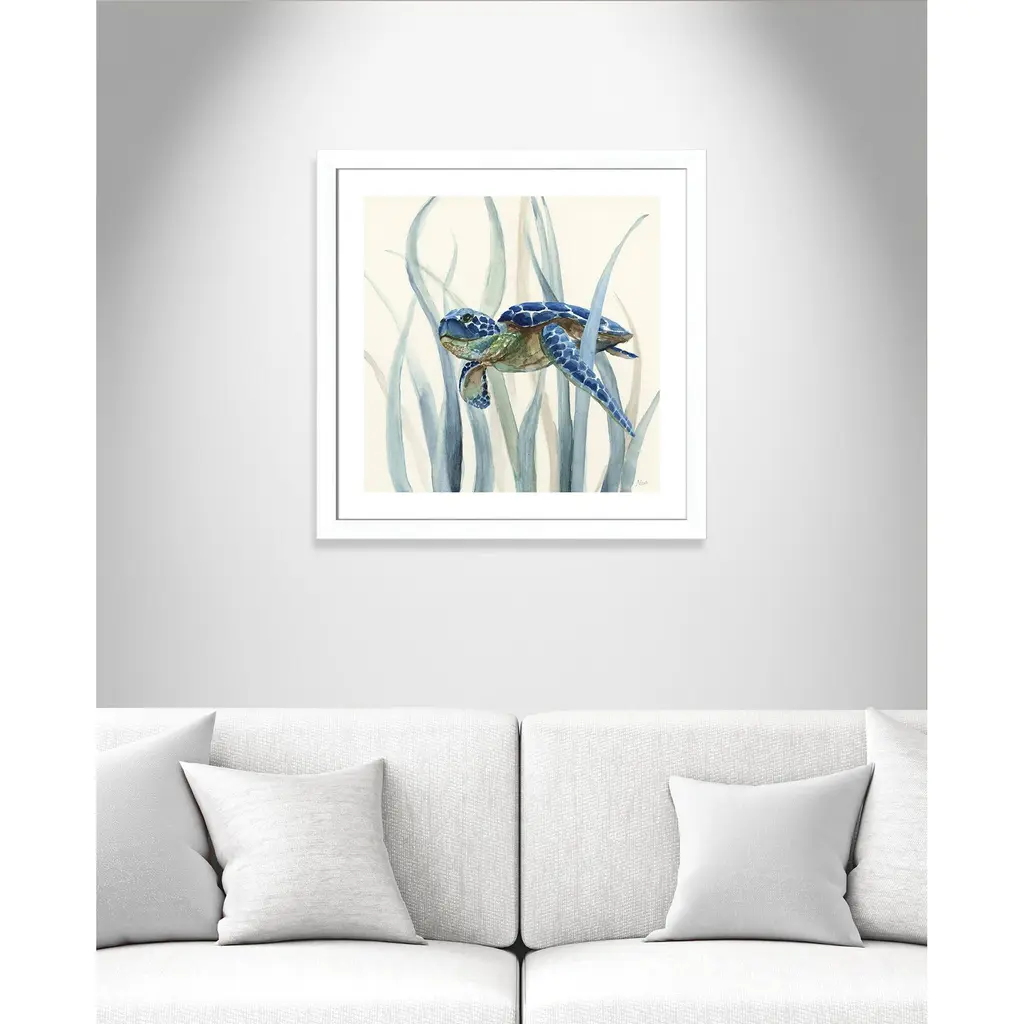 Turtle in Seagrass II', a fun and vibrant coastal sea life image of a turtle happily swimming through seagrass, will transform your home into a tropical getaway! This indigo masterpiece is the perfect pop of color for your coastal home décor. Finished in a modern frame made of PS materials, this is the perfect addition to your walls. Archival fine art giclée print on acid-free and lignin-free 100% cotton rag paper; image includes a bright white self-matting border Printed with gallery-quality inks using the finest giclée print technology for unsurpassed color gamut and clarity Lightweight and finished under shatter-resistant acrylic; hanging hardware attached for easy and secure installation Handcrafted in the USA and ships with a Certificate of Authenticity Lightweight and finished under shatter-resistant acrylic