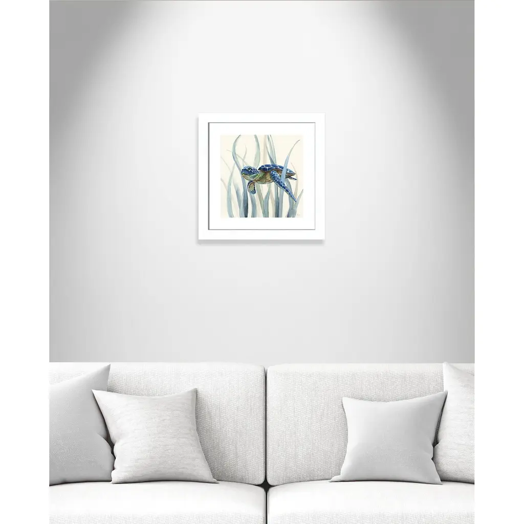 Turtle in Seagrass II', a fun and vibrant coastal sea life image of a turtle happily swimming through seagrass, will transform your home into a tropical getaway! This indigo masterpiece is the perfect pop of color for your coastal home décor. Finished in a modern frame made of PS materials, this is the perfect addition to your walls. Archival fine art giclée print on acid-free and lignin-free 100% cotton rag paper; image includes a bright white self-matting border Printed with gallery-quality inks using the finest giclée print technology for unsurpassed color gamut and clarity Lightweight and finished under shatter-resistant acrylic; hanging hardware attached for easy and secure installation Handcrafted in the USA and ships with a Certificate of Authenticity Lightweight and finished under shatter-resistant acrylic