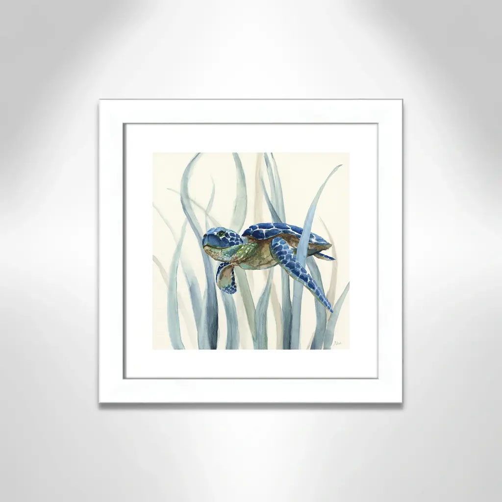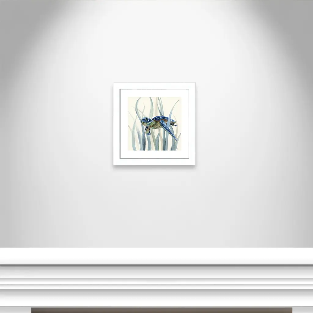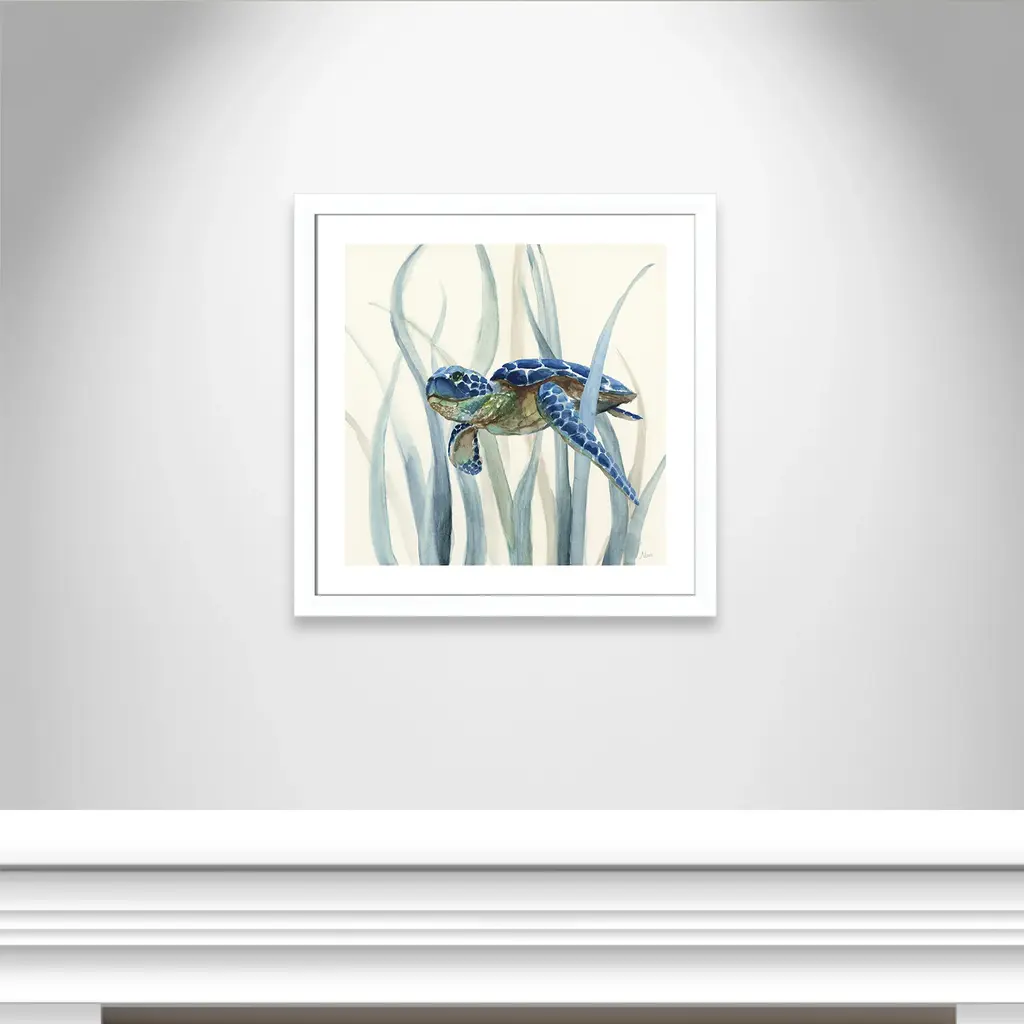 Turtle in Seagrass II', a fun and vibrant coastal sea life image of a turtle happily swimming through seagrass, will transform your home into a tropical getaway! This indigo masterpiece is the perfect pop of color for your coastal home décor. Finished in a modern frame made of PS materials, this is the perfect addition to your walls. Archival fine art giclée print on acid-free and lignin-free 100% cotton rag paper; image includes a bright white self-matting border Printed with gallery-quality inks using the finest giclée print technology for unsurpassed color gamut and clarity Lightweight and finished under shatter-resistant acrylic; hanging hardware attached for easy and secure installation Handcrafted in the USA and ships with a Certificate of Authenticity Lightweight and finished under shatter-resistant acrylic
