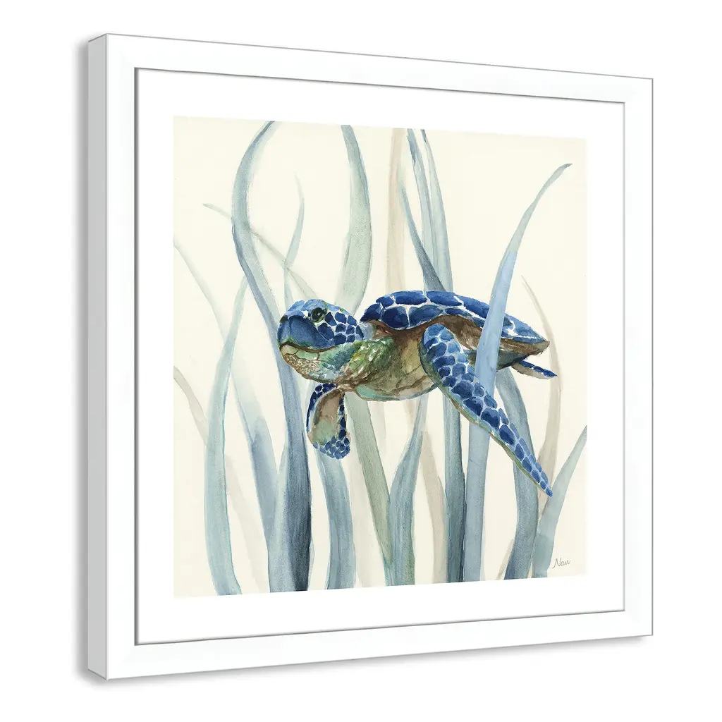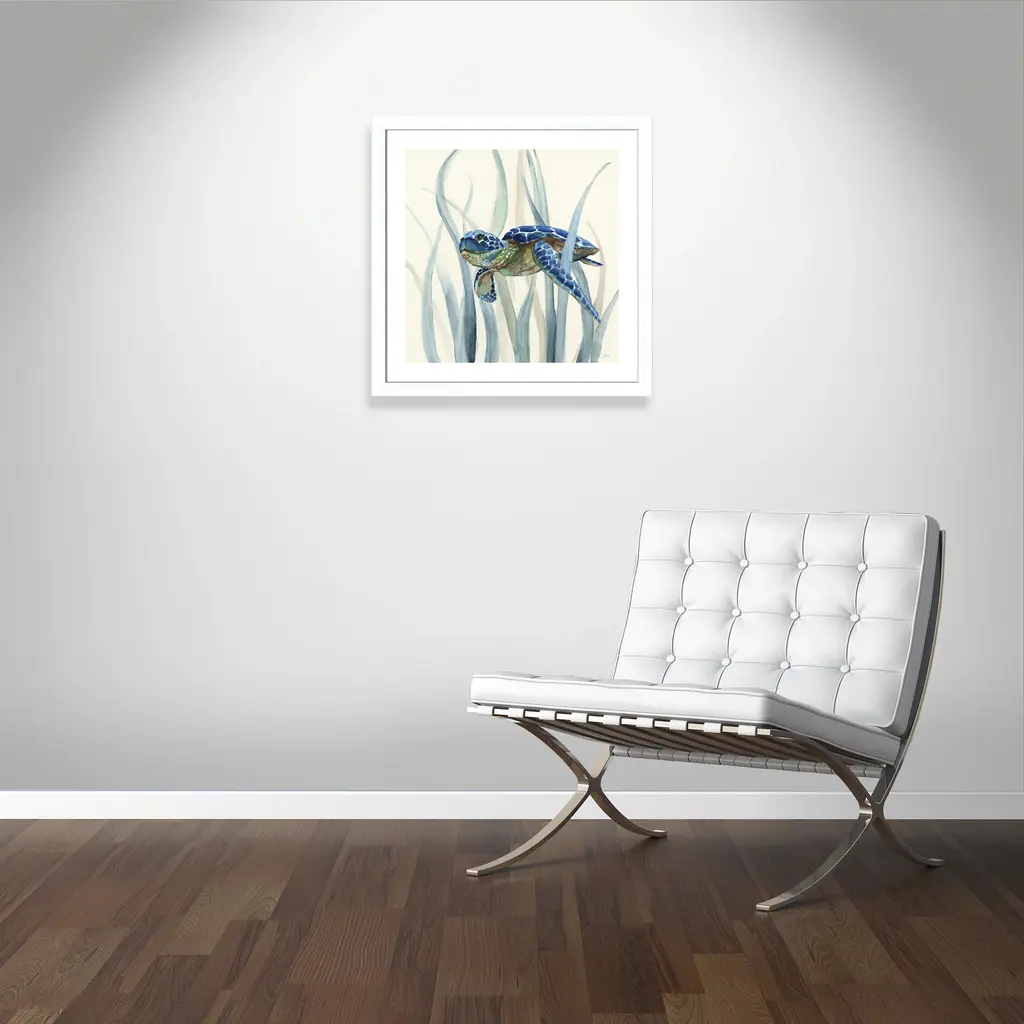 Turtle in Seagrass II', a fun and vibrant coastal sea life image of a turtle happily swimming through seagrass, will transform your home into a tropical getaway! This indigo masterpiece is the perfect pop of color for your coastal home décor. Finished in a modern frame made of PS materials, this is the perfect addition to your walls. Archival fine art giclée print on acid-free and lignin-free 100% cotton rag paper; image includes a bright white self-matting border Printed with gallery-quality inks using the finest giclée print technology for unsurpassed color gamut and clarity Lightweight and finished under shatter-resistant acrylic; hanging hardware attached for easy and secure installation Handcrafted in the USA and ships with a Certificate of Authenticity Lightweight and finished under shatter-resistant acrylic