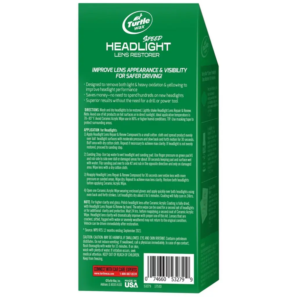 Removes medium oxidation and seals headlights to prevent future yellowing. Lens base coat and sealing wipe system protects and prolongs lens clarity for years. There's no need to spend hundreds of dollars on new headlights. The kit provides superior results without the need for a drill or power tool. This kit provides an easy-to-use solution to dull headlights and increases visibility for safer driving.The Turtle Wax story started with the launch of the first-ever bottled car wax in 1946. More than 75 years later, America’s favorite car care brand is still capturing the attention of the auto appearance category. With product distribution in more than 120 countries, the Turtle Wax brand resonates around the globe, but the brand’s heart remains in its hometown of Chicago, where award-winning innovation is developed to this day.