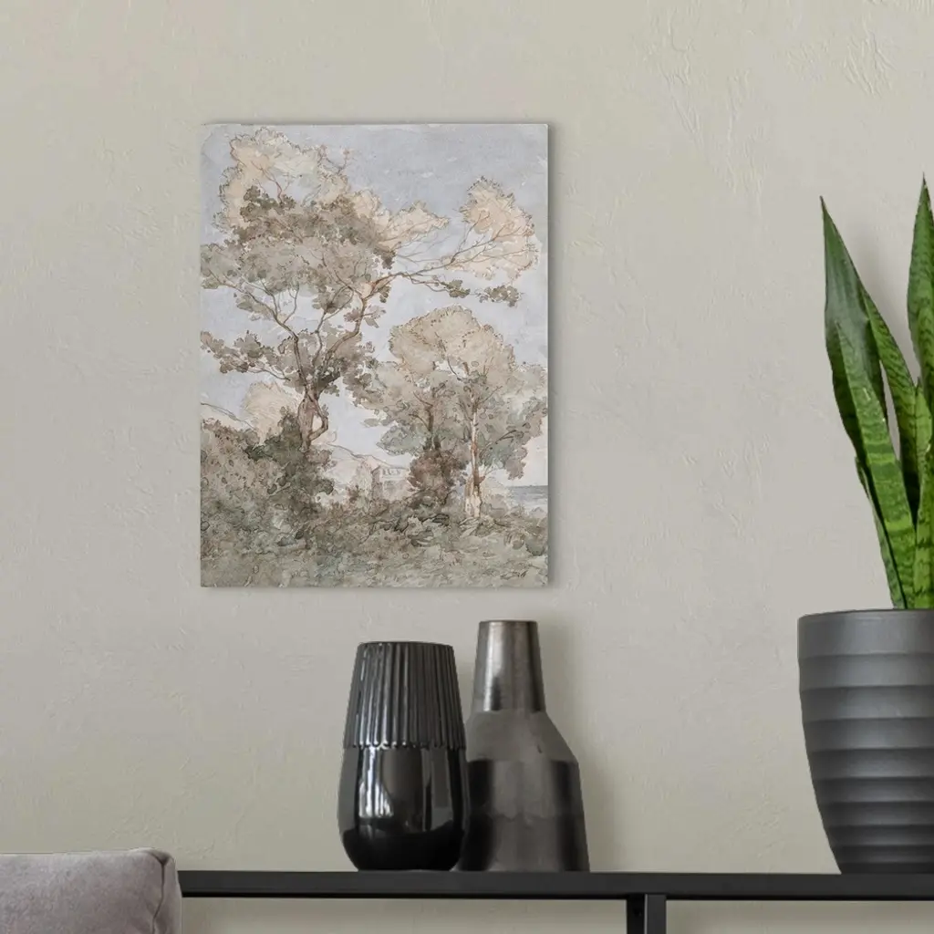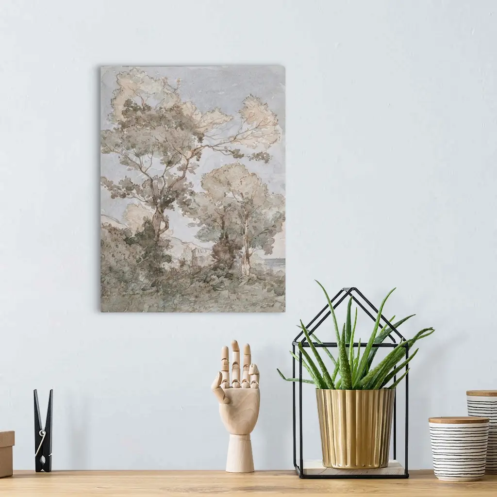 A sun drenched Italian landscape with soaring trees and blue grey skies.