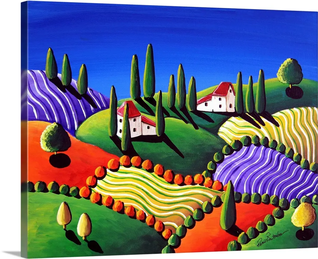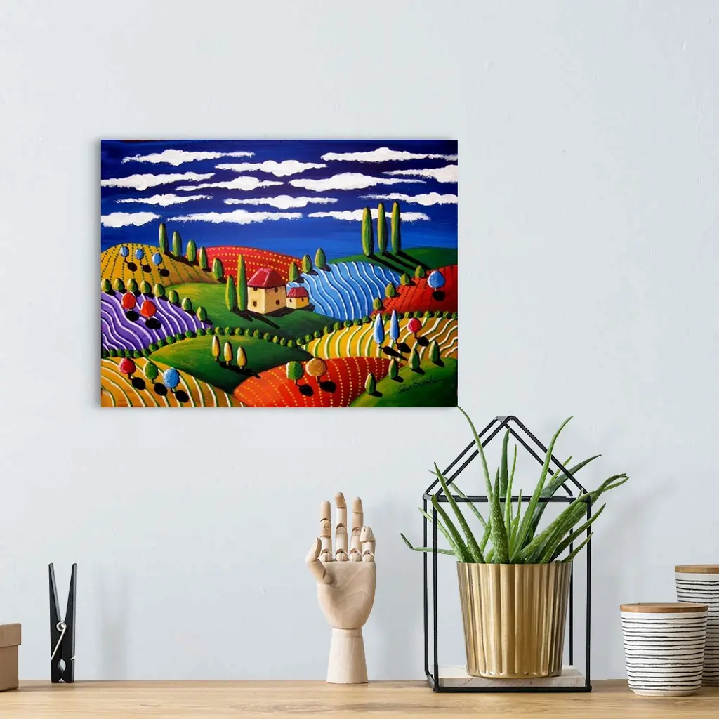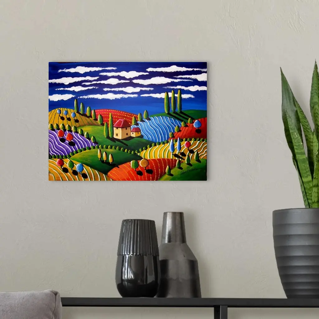 Colorful landscape with rolling hills and trees and a single house in the middle with a cloudy sky above.