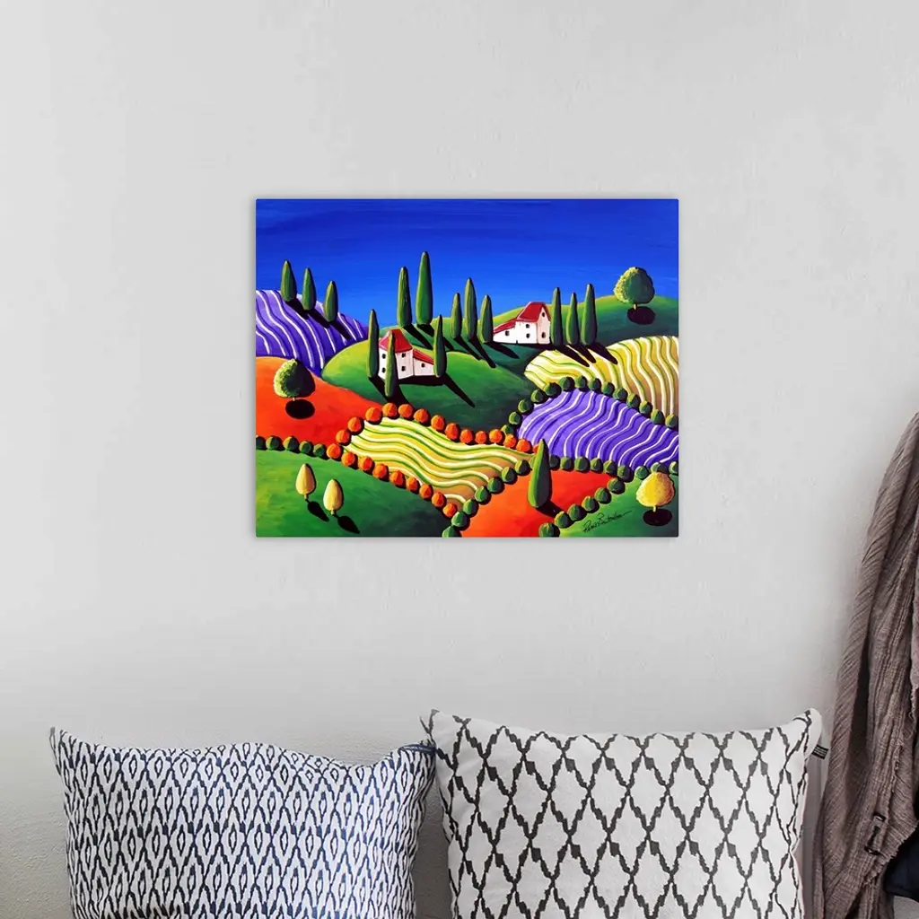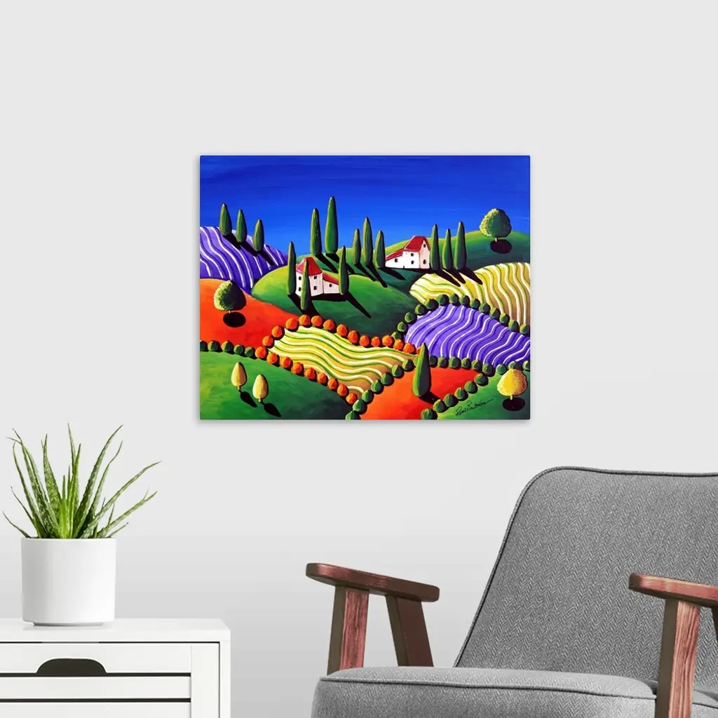 Colorful Tuscan scene of houses amid tall poplar trees on rolling hills