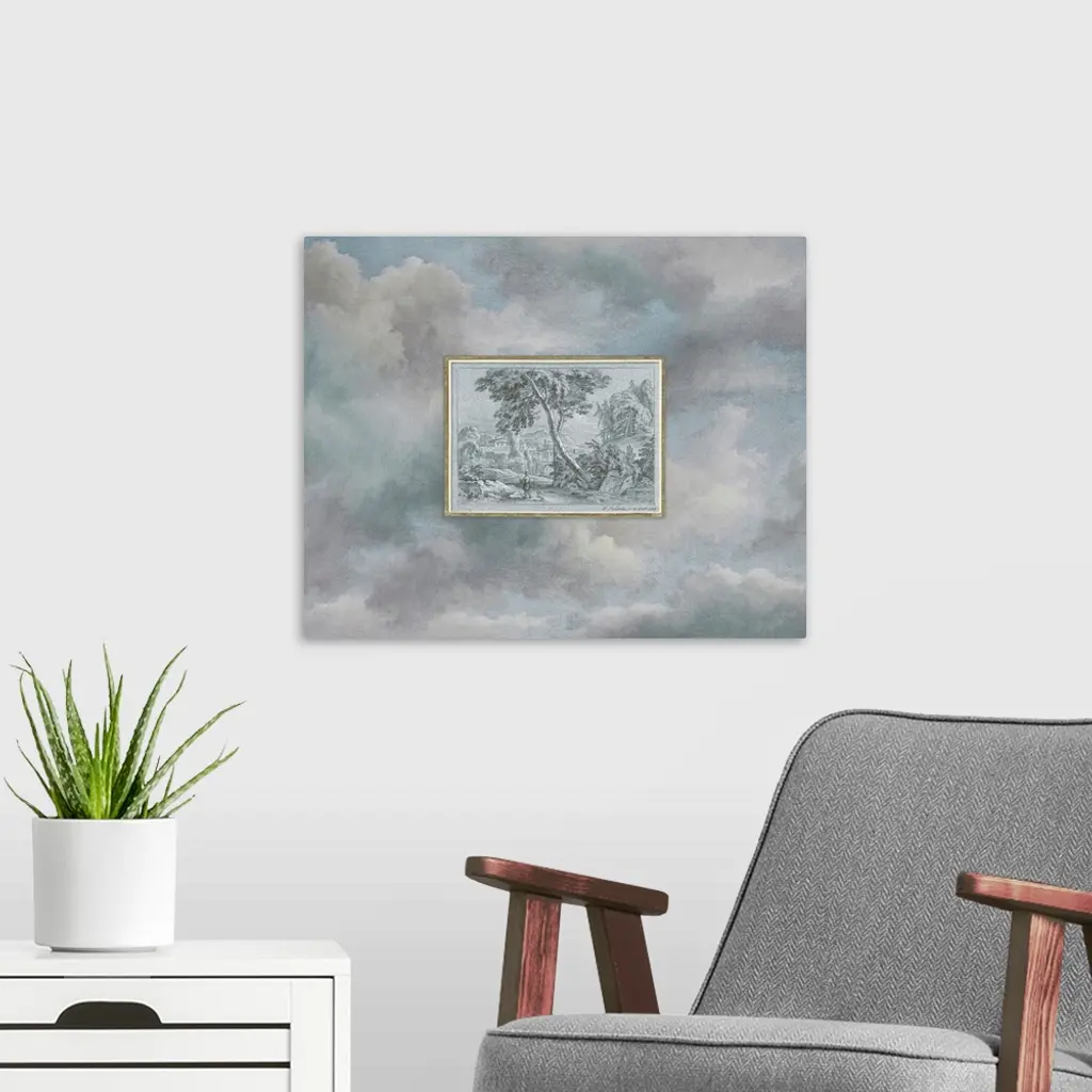 A vintage pastoral print of a villa in the county, framed in gold, floats above an ethereal sky filled with clouds.