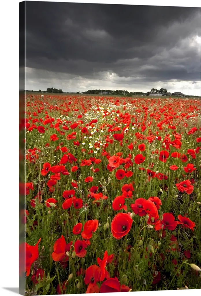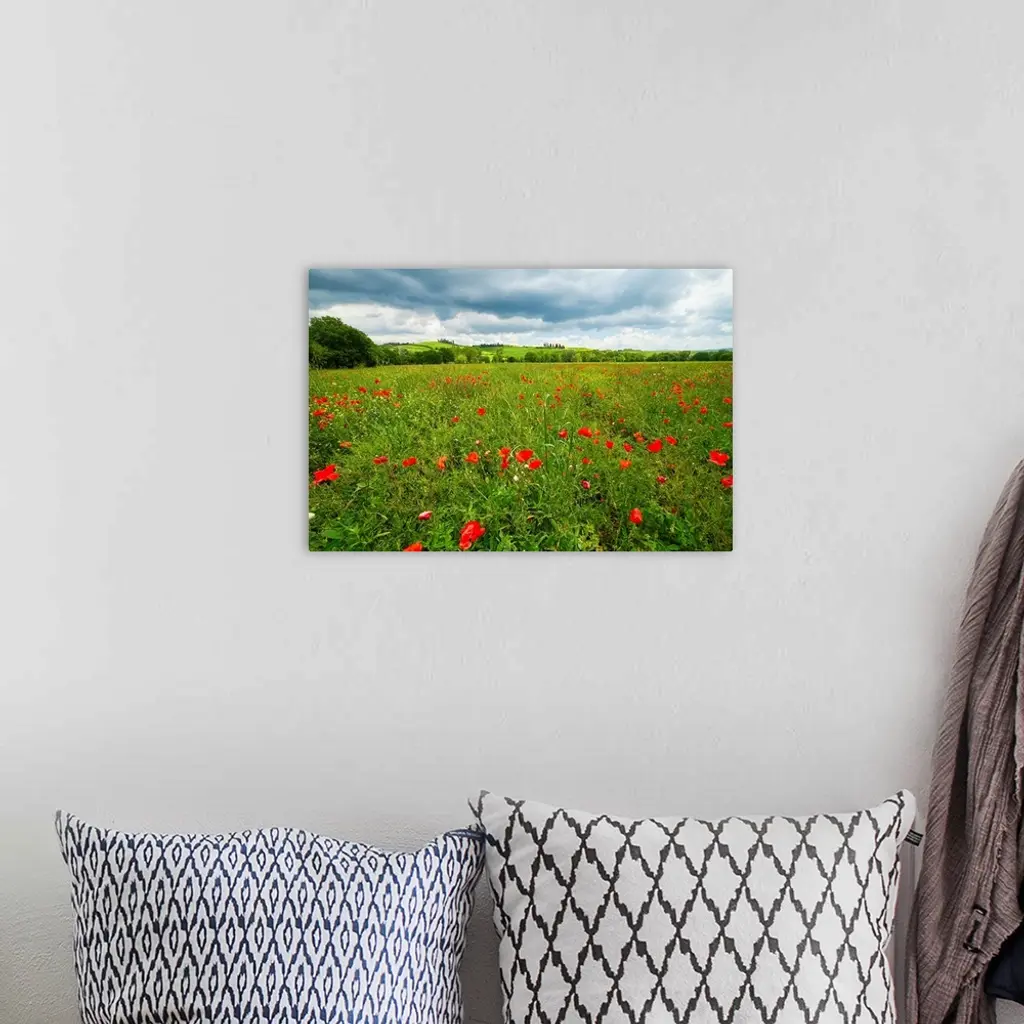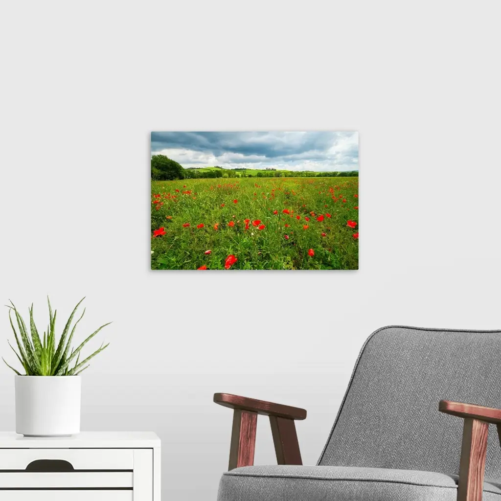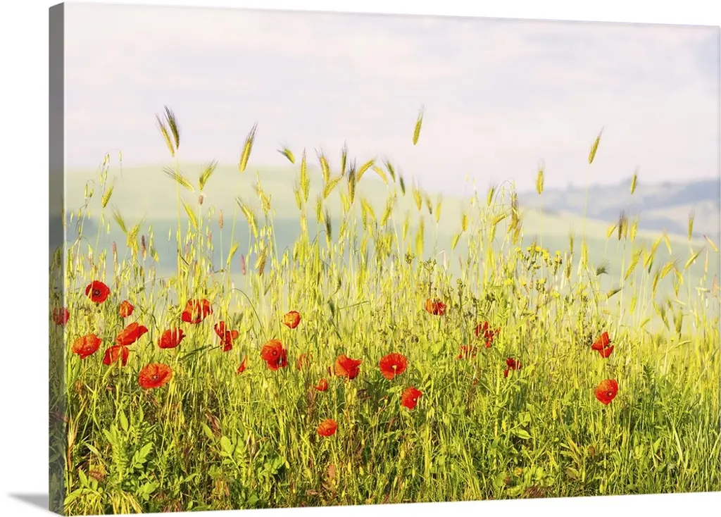 Spring meadow filled with poppies, Pienza, Val d'Orcia, Tuscany, Italy.