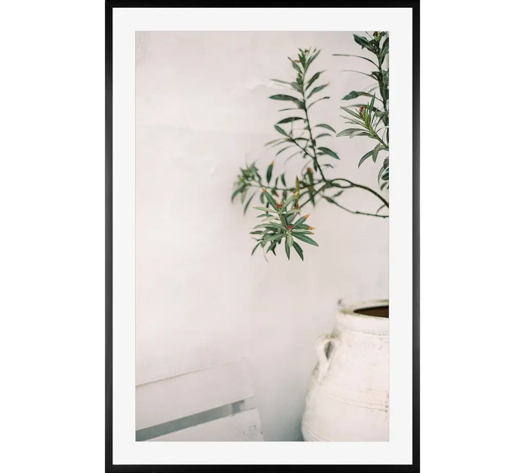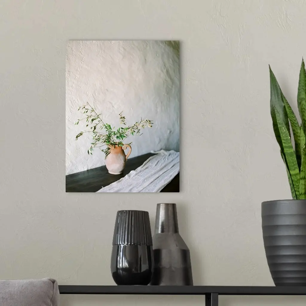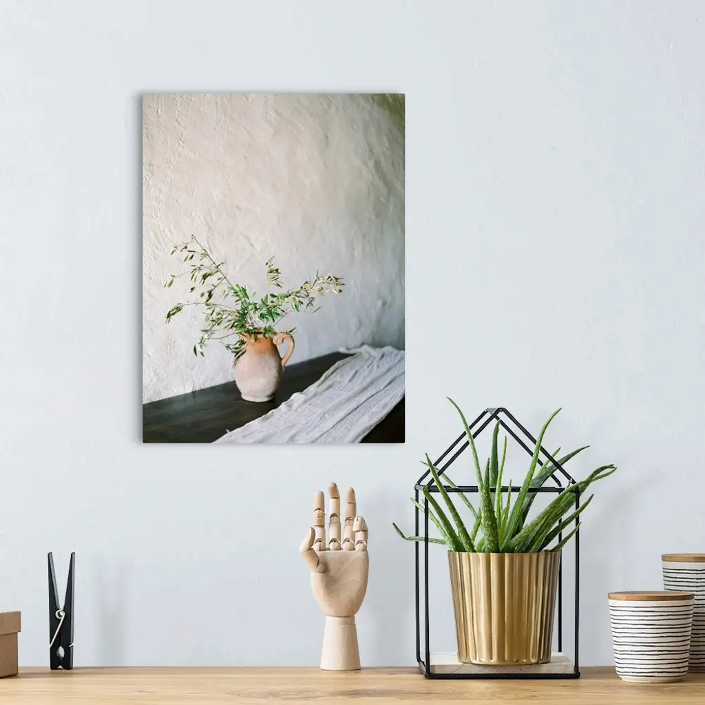 A photograph of olive branches in a clay jug in a simple indoor mediterranean setting.