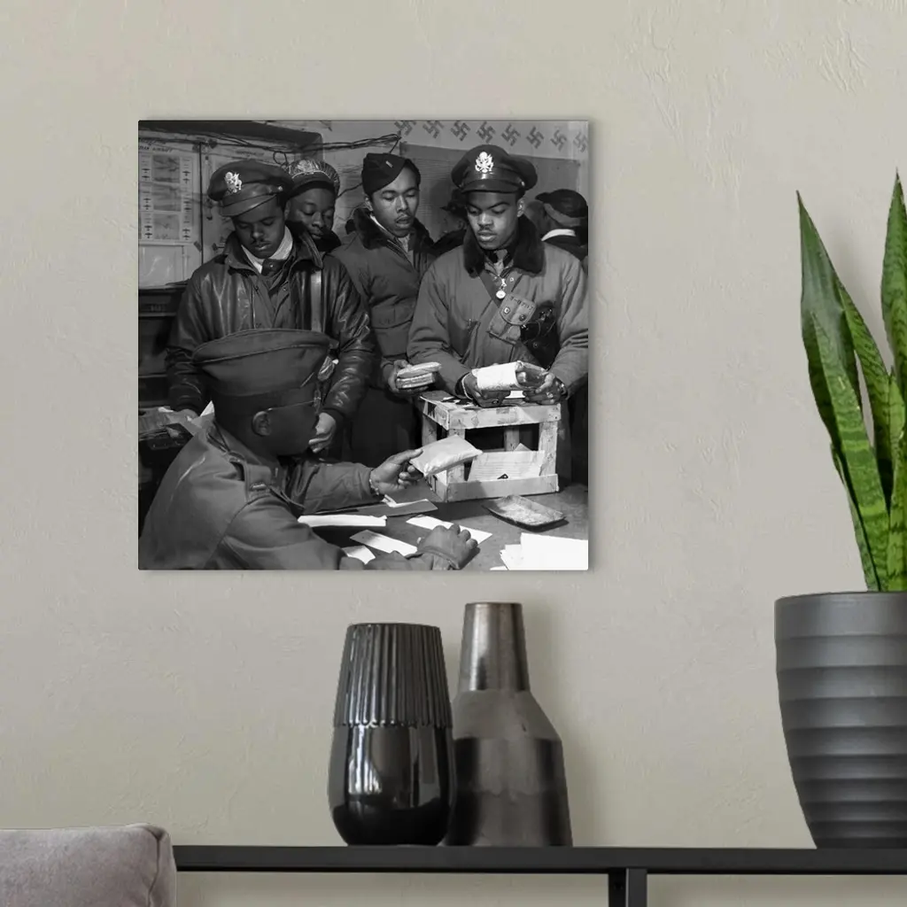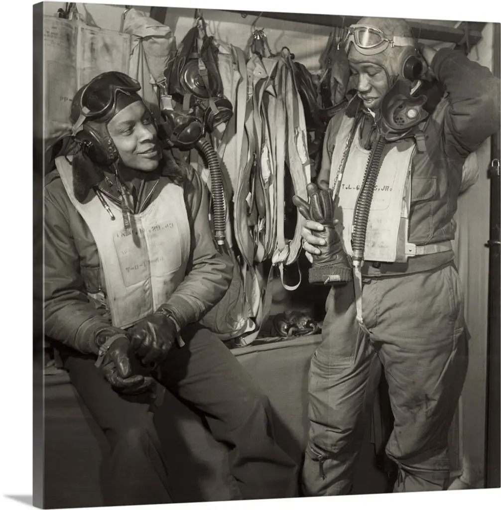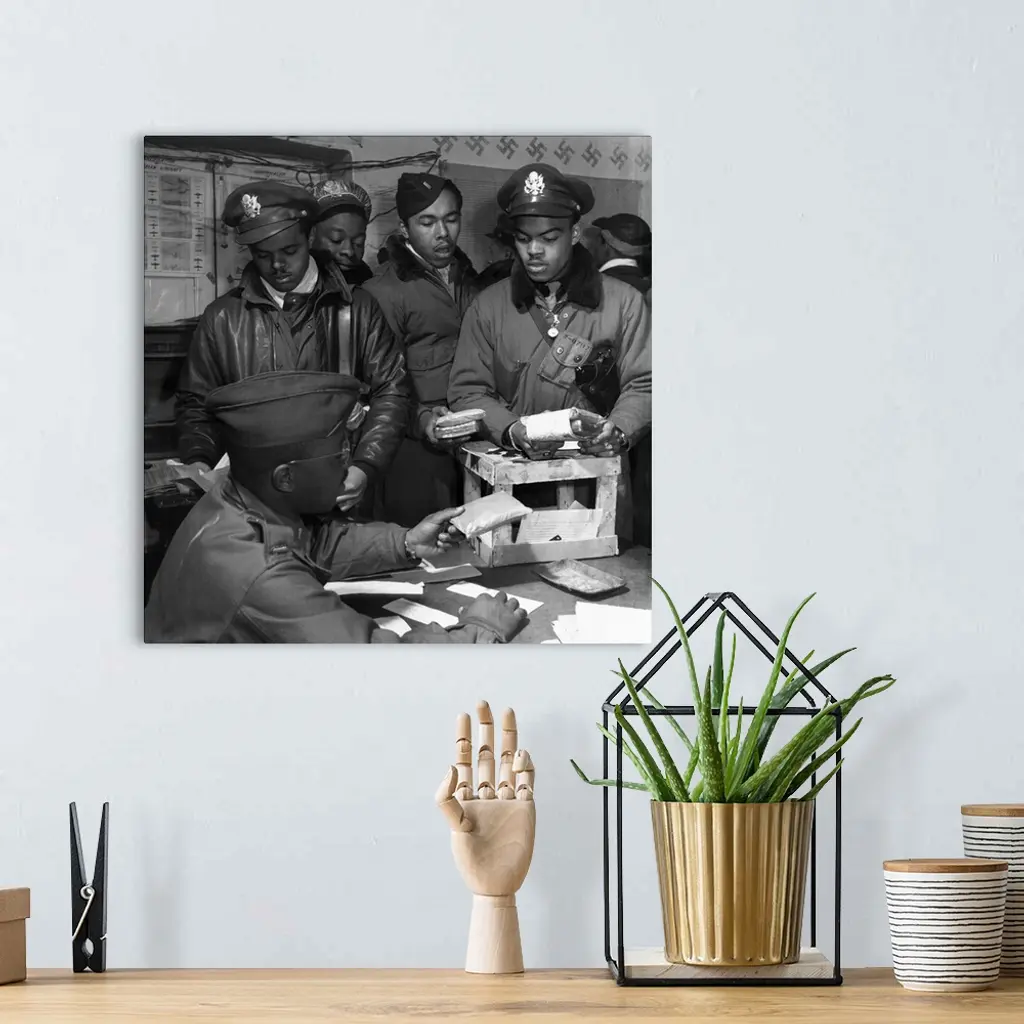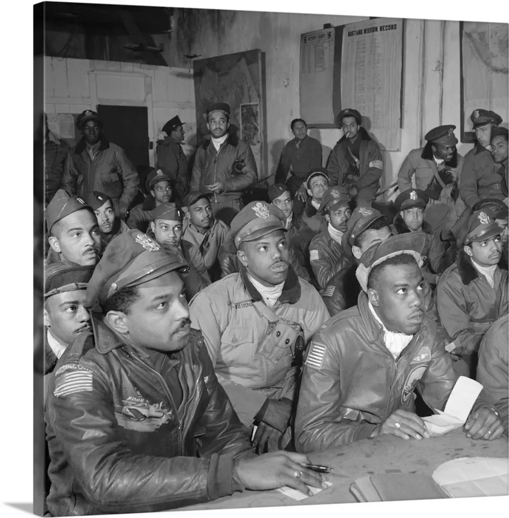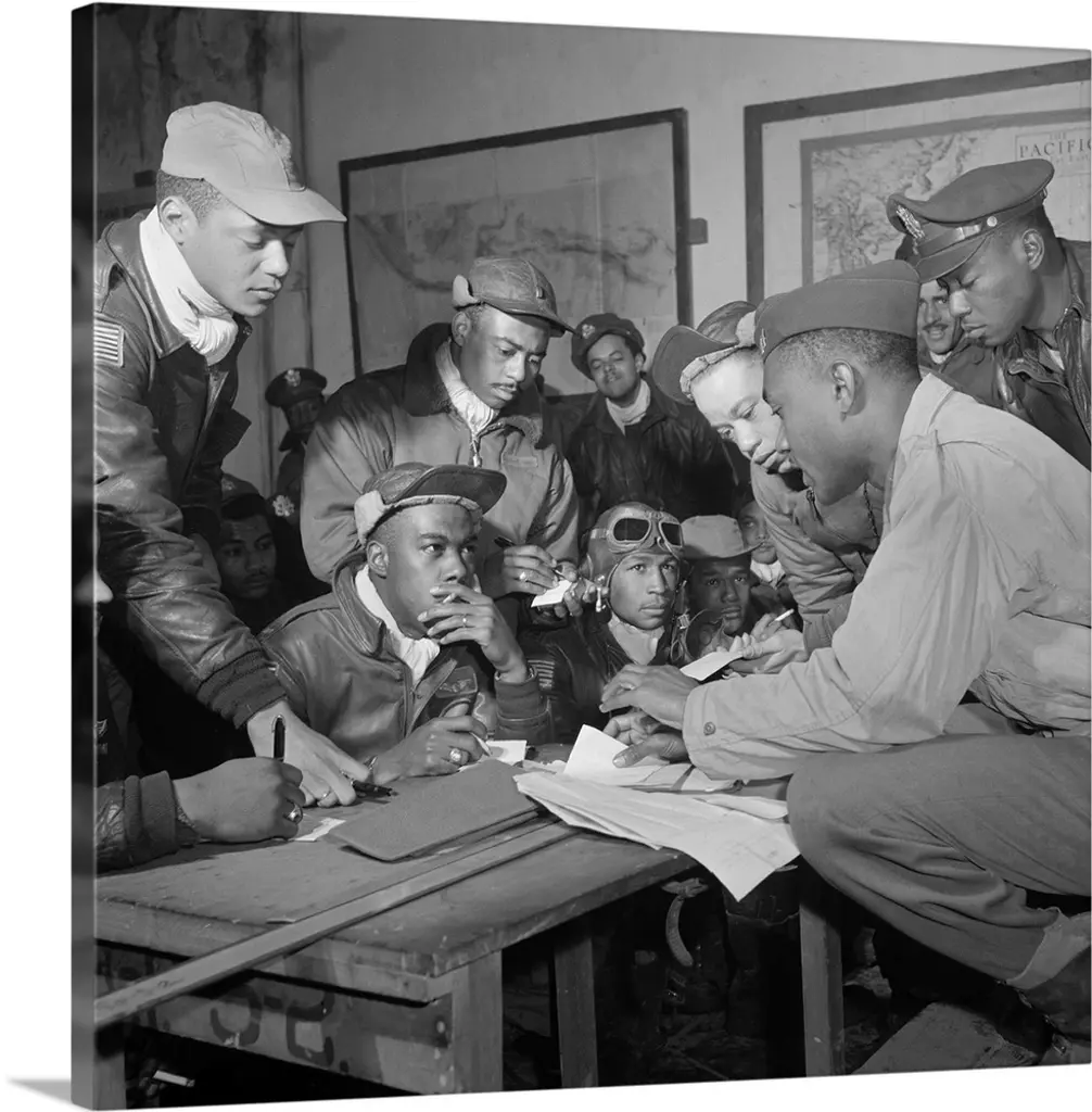 Fighter pilots of the Tuskegee Airmen 332nd Fighter Group receive 'Escape kits' (cyanide) at Ramitelli Airfield, Italy. Photographby Toni Frissell, March 1945. Seated: Theodore Lumpkin, Jr. Standing, left to right: Joseph Chineworth, Robert Robinson, Driskell Ponder, Robert Williams.