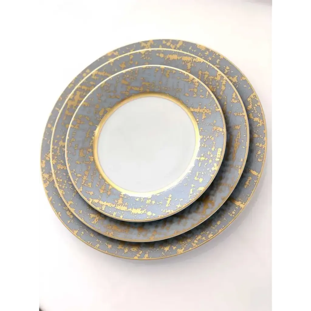 Using the classic Royal Limoges Recamier shapes, Tweed dinnerware is handmade from Limoges porcelain and features a timeless gold motif referencing the traditional fabric. Gold memories of the tweed weft and weave are applied over a handsome grey border before handpainted with 24k gold ri!!ms. The collection marries itself with Mak grey/gold, Makassar grey/gold as well as Arcades grey/gold from Deshoulieres. Truly endless possibilities! As the oldest porcelain factory in the French city of Limoges, Royal Limoges boasts a long history of creating hand crafted dinnerware from its own kaolin clay. Since 1797, its exclusive patterns have been enjoyed by clients worldwide.