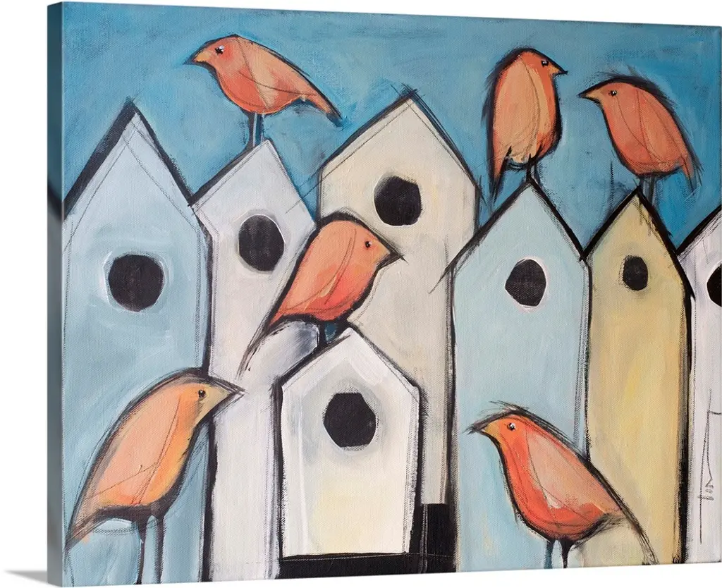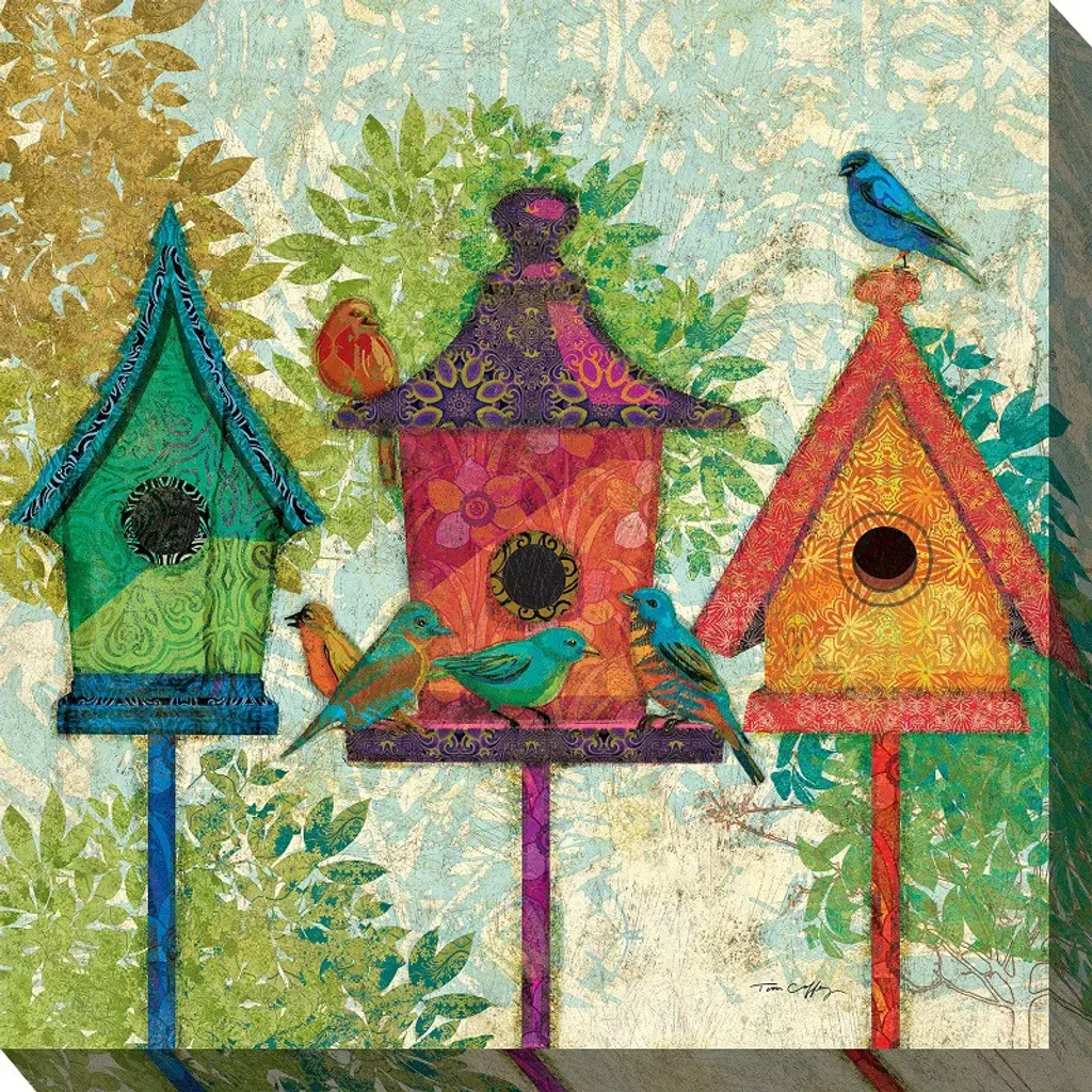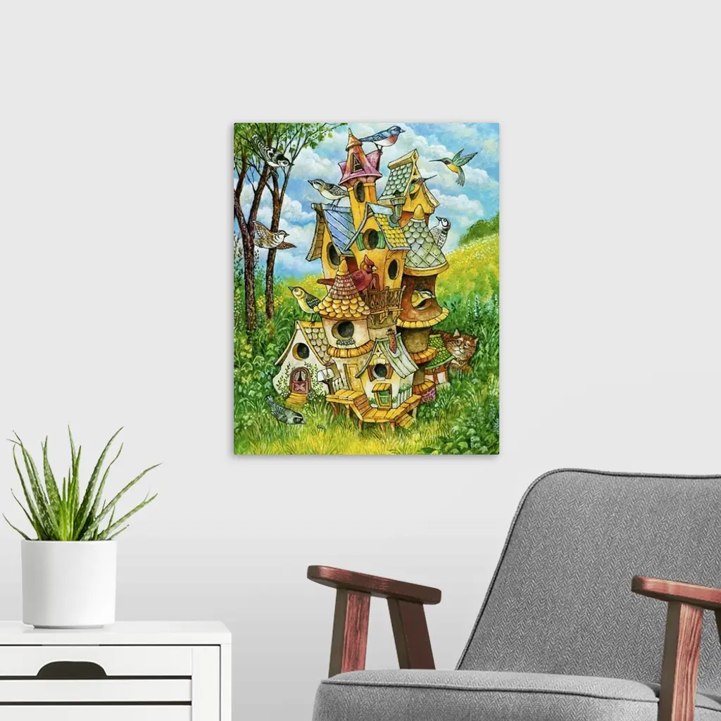 A large bird house with birds on it and a cat lying in the grass behind the house.