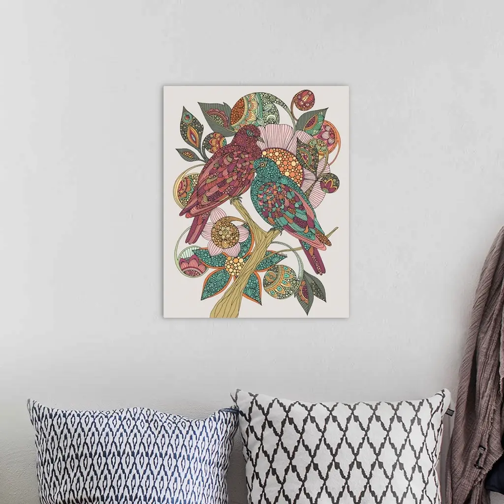 Stunning illustration of two Turtle doves sitting on a branch surrounded by leaves and paisley swirls. Illustrated in intricate detail and colored in jewel tones.