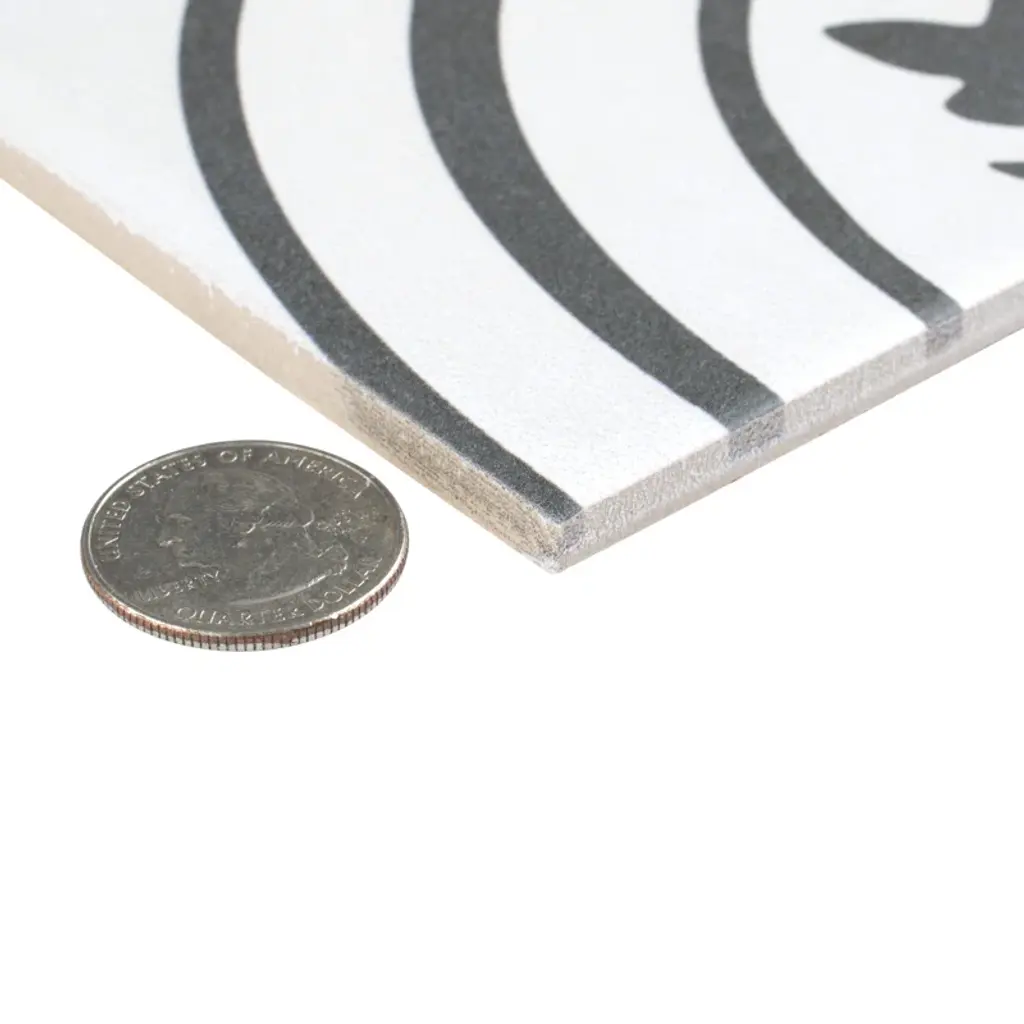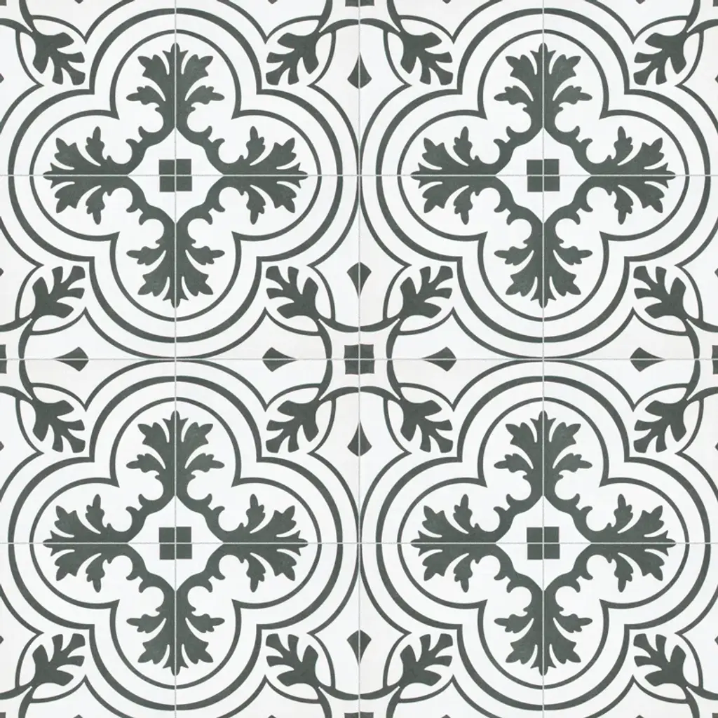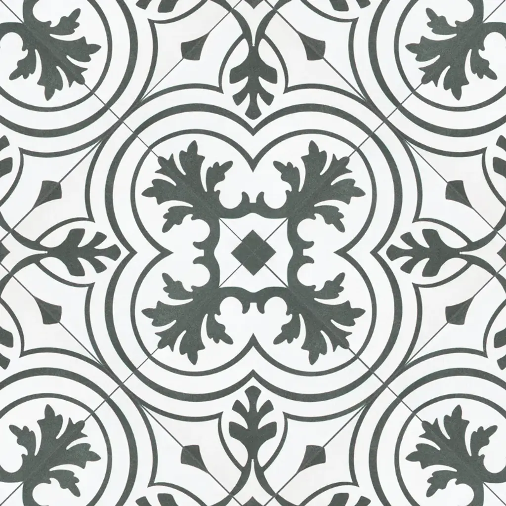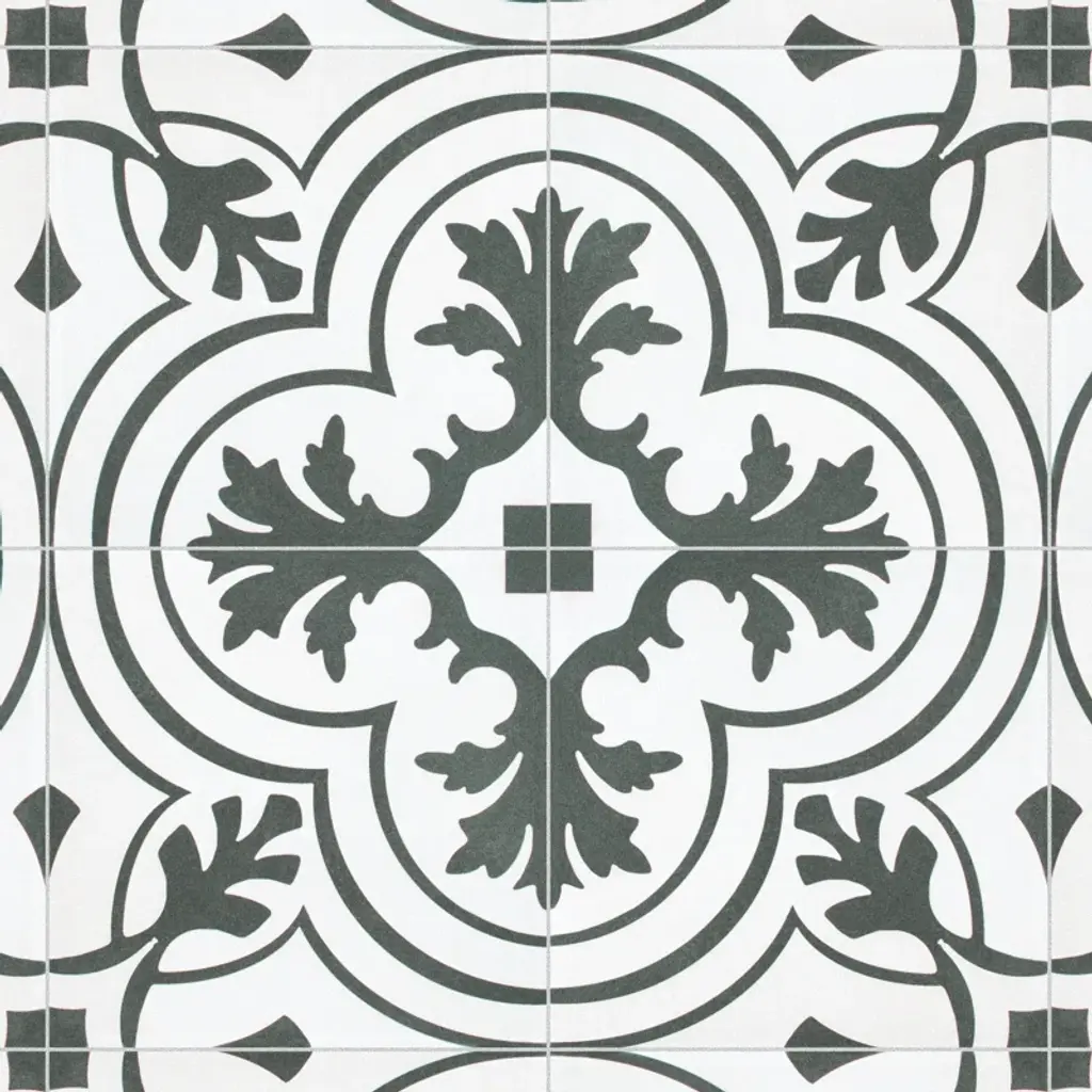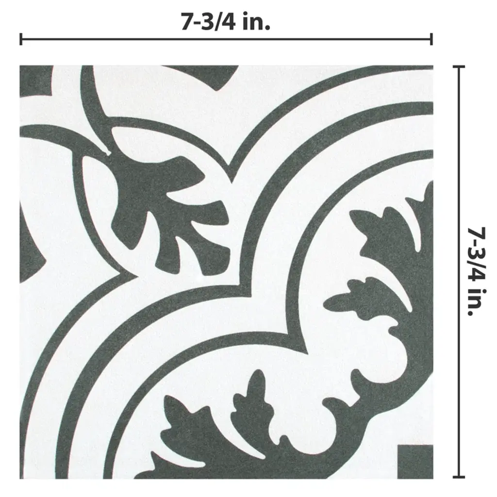 Inspired by artisan cement tiles, the Twenties series 8" x 8" ceramic Portugal wall & floor Tile captures the look of authentic encaustic tiles with a versatile ceramic body. This square tile features floral old-world patterns in charcoal black tones that are accented by simplistic arcs. Set on a snow-white base glaze, the contrasting design features a weathered, speckled look, replicating the beauty of Portugal's design and offering a unique blend of old-world style and modern appeal. This visually rich floor and wall tile can blend into virtually any design theme, ranging from contemporary projects to traditional installations. Its durable and frost-resistant features make this an ideal choice for indoor and outdoor installations including kitchens, bathrooms, backsplashes, showers, entryways, patios, and fireplace facades. It is a perfect choice on its own or paired with other products in the Forties Collection. Tile is the better choice for your space. This tile is made from natural ingredients, making it a healthy choice as it is free from allergens, VOCs, formaldehyde, and PVC.