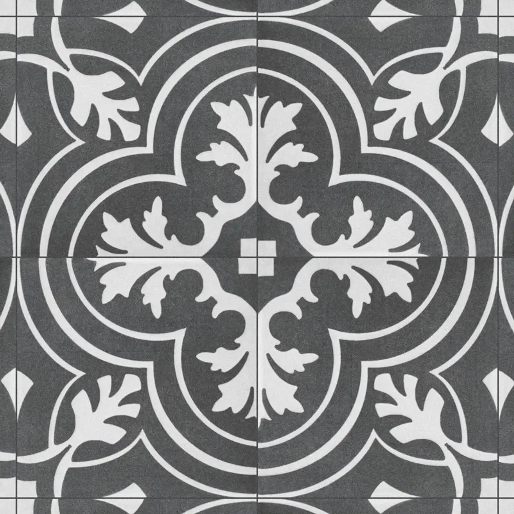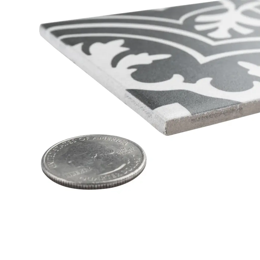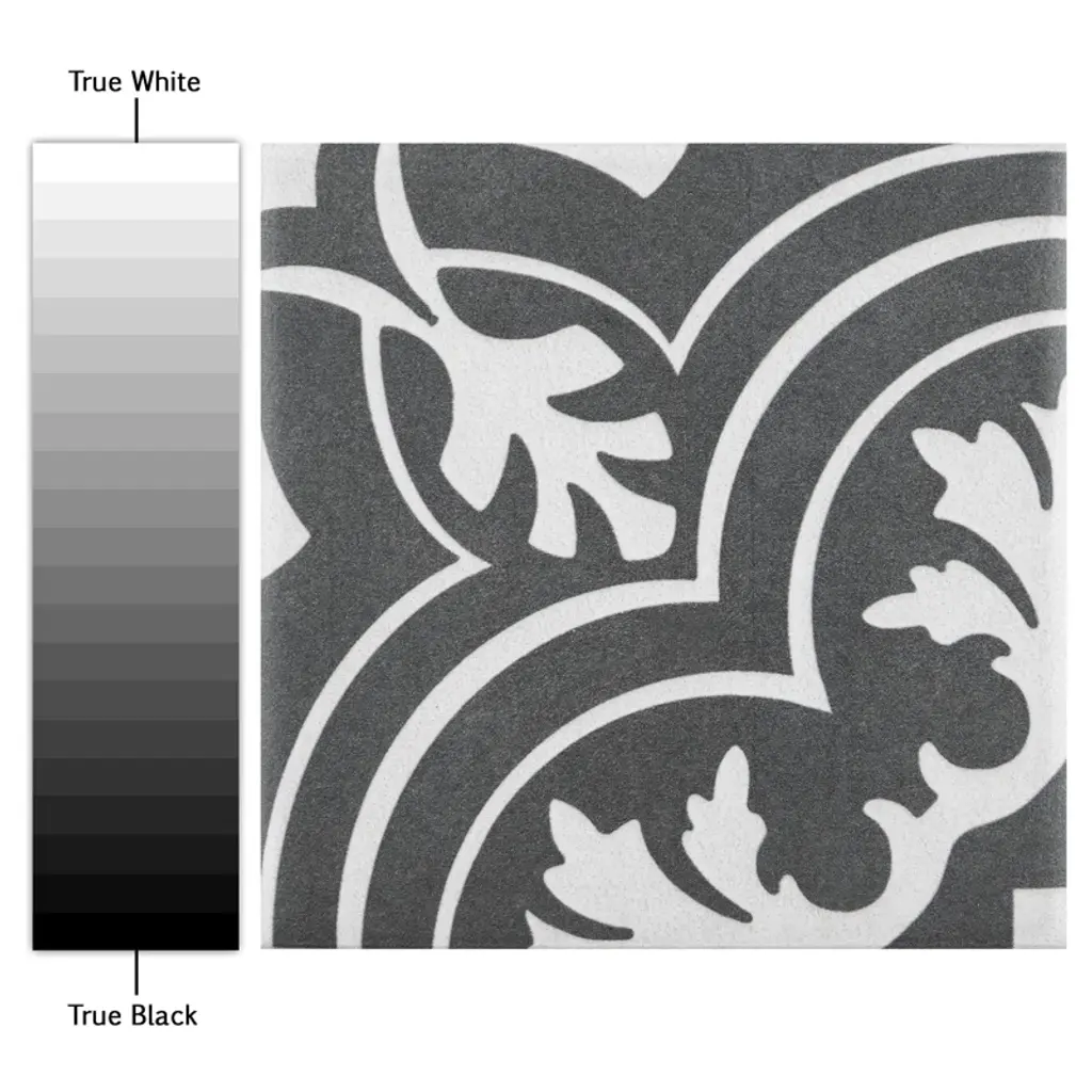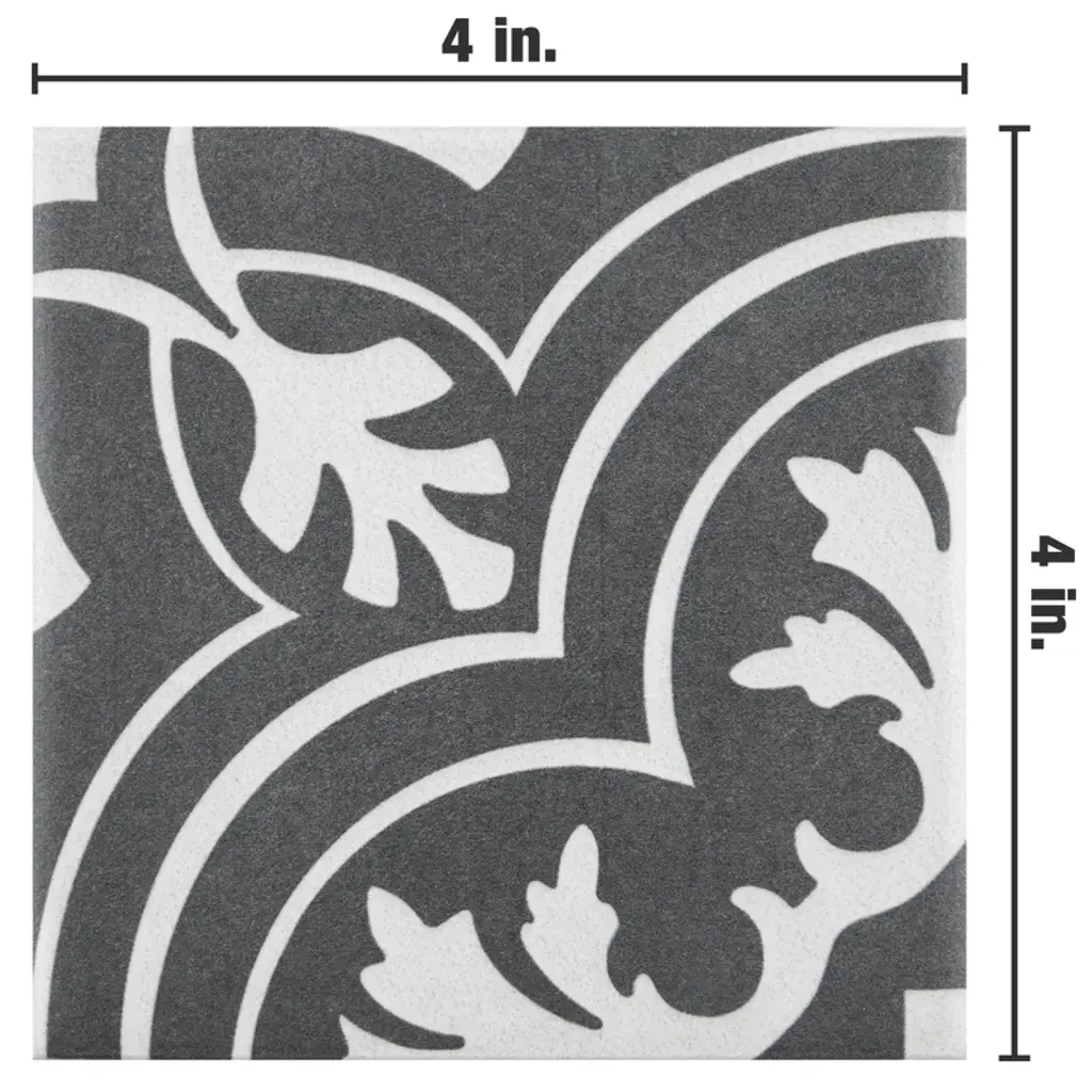 Inspired by artisan cement tiles, this product captures the look of authentic encaustic tiles with a versatile ceramic body. This smaller version features floral old-world patterns in snow-white tones that are accented by simplistic arcs. Set on a charcoal black base glaze, the contrasting design features a weathered, speckled look, replicating the beauty of Spanish design and offering a unique blend of old-world style and modern appeal. This visually rich floor and wall tile can blend into virtually any design theme, ranging from contemporary projects to traditional installations. Its durable and frost-resistant features make this an ideal choice for indoor and outdoor installations including kitchens, bathrooms, backsplashes, showers, entryways, patios, and fireplace facades. Tile is the better choice for your space. This tile is made from natural ingredients, making it a healthy choice as it is free from allergens, VOCs, formaldehyde, and PVC.