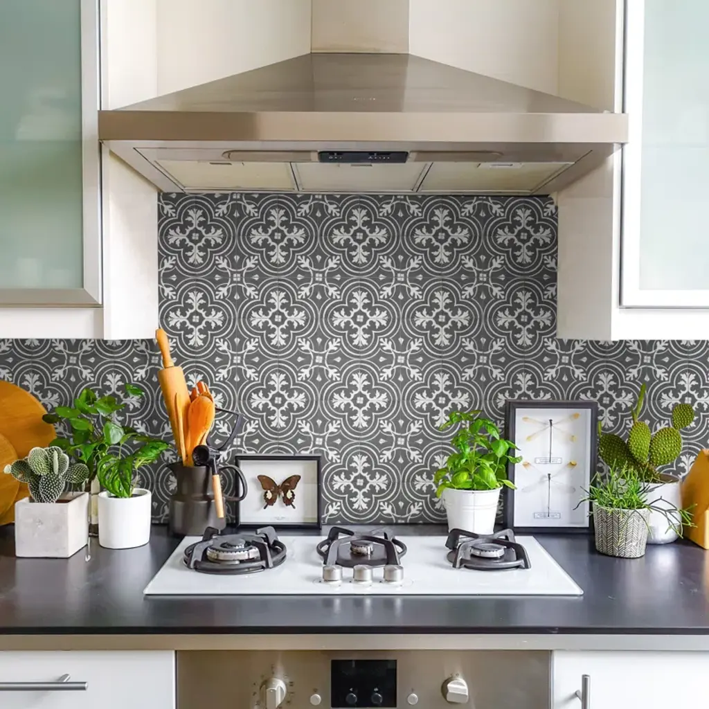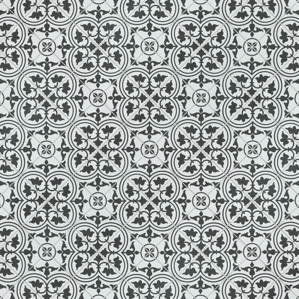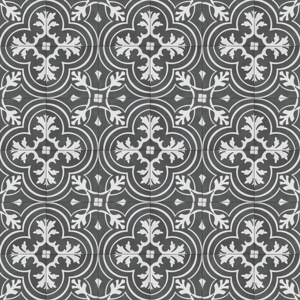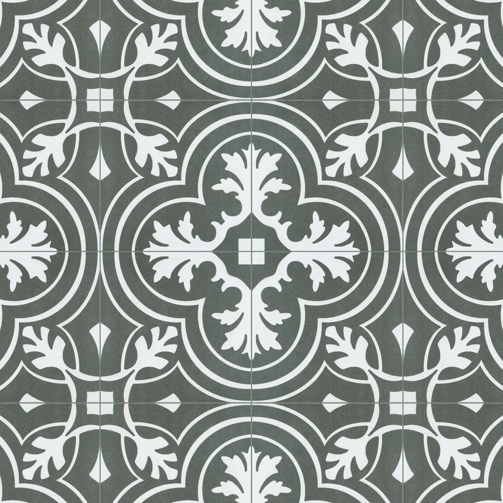 Inspired by artisan cement tiles, this product captures the look of authentic encaustic tiles with a versatile ceramic body. This smaller version features floral old-world patterns in snow-white tones that are accented by simplistic arcs. Set on a charcoal black base glaze, the contrasting design features a weathered, speckled look, replicating the beauty of Spanish design and offering a unique blend of old-world style and modern appeal. This visually rich floor and wall tile can blend into virtually any design theme, ranging from contemporary projects to traditional installations. Its durable and frost-resistant features make this an ideal choice for indoor and outdoor installations including kitchens, bathrooms, backsplashes, showers, entryways, patios, and fireplace facades. Tile is the better choice for your space. This tile is made from natural ingredients, making it a healthy choice as it is free from allergens, VOCs, formaldehyde, and PVC.