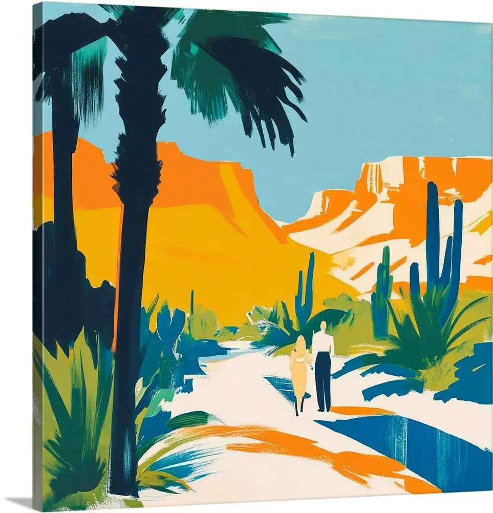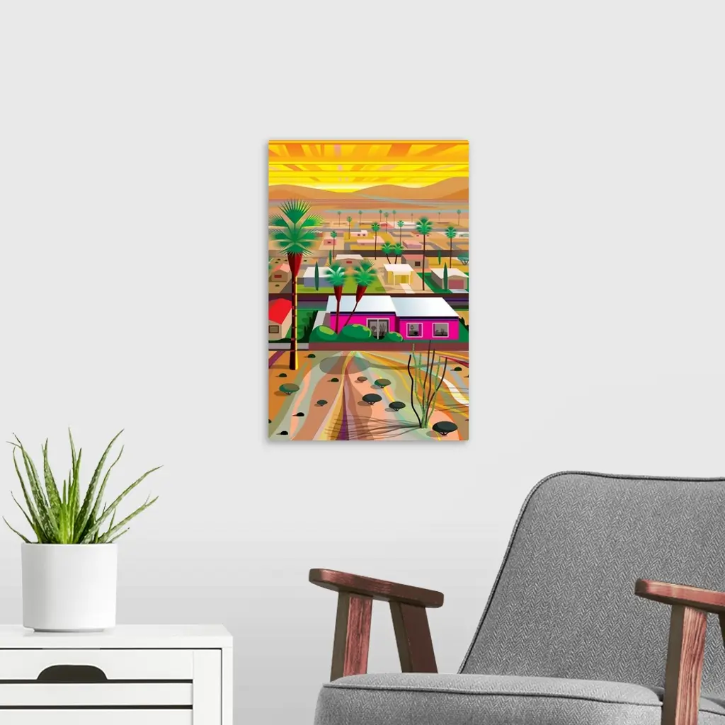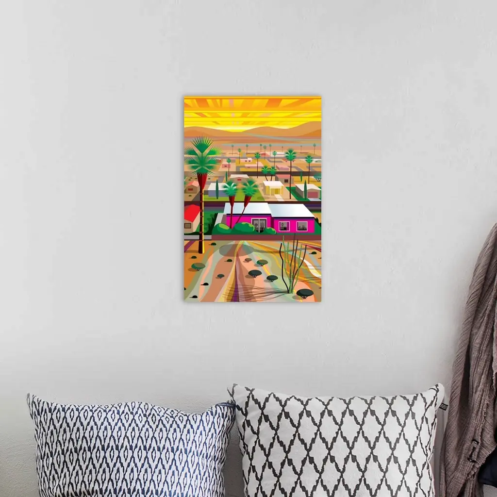 Vertical digital illustration of an Arizona town with homes in the middle of the desert and tall palm trees surrounding.