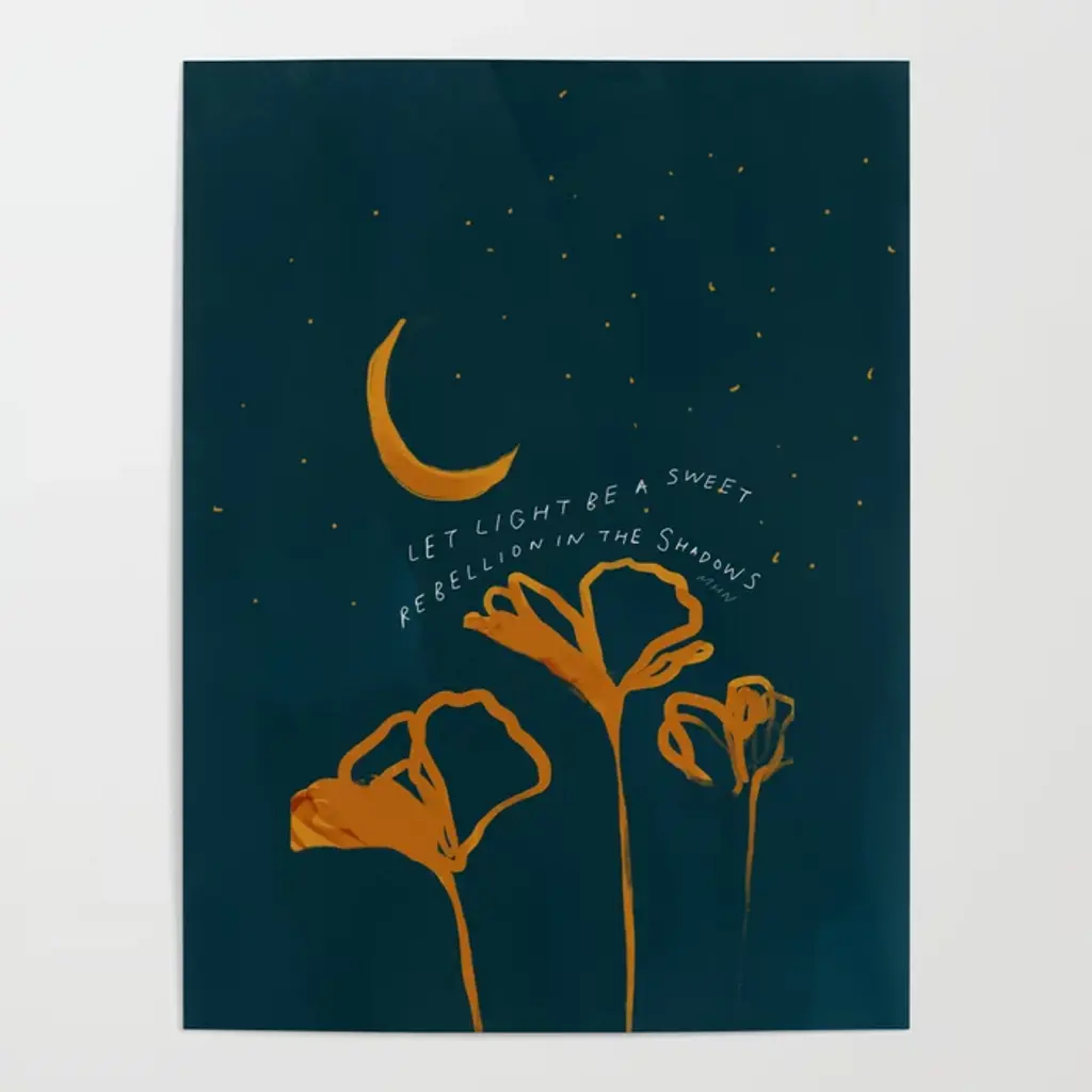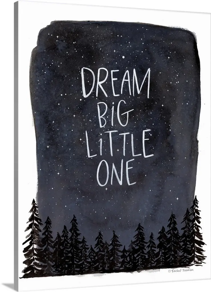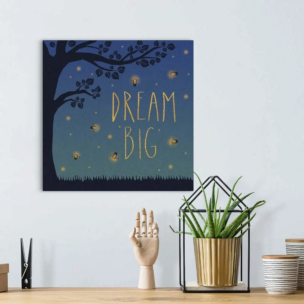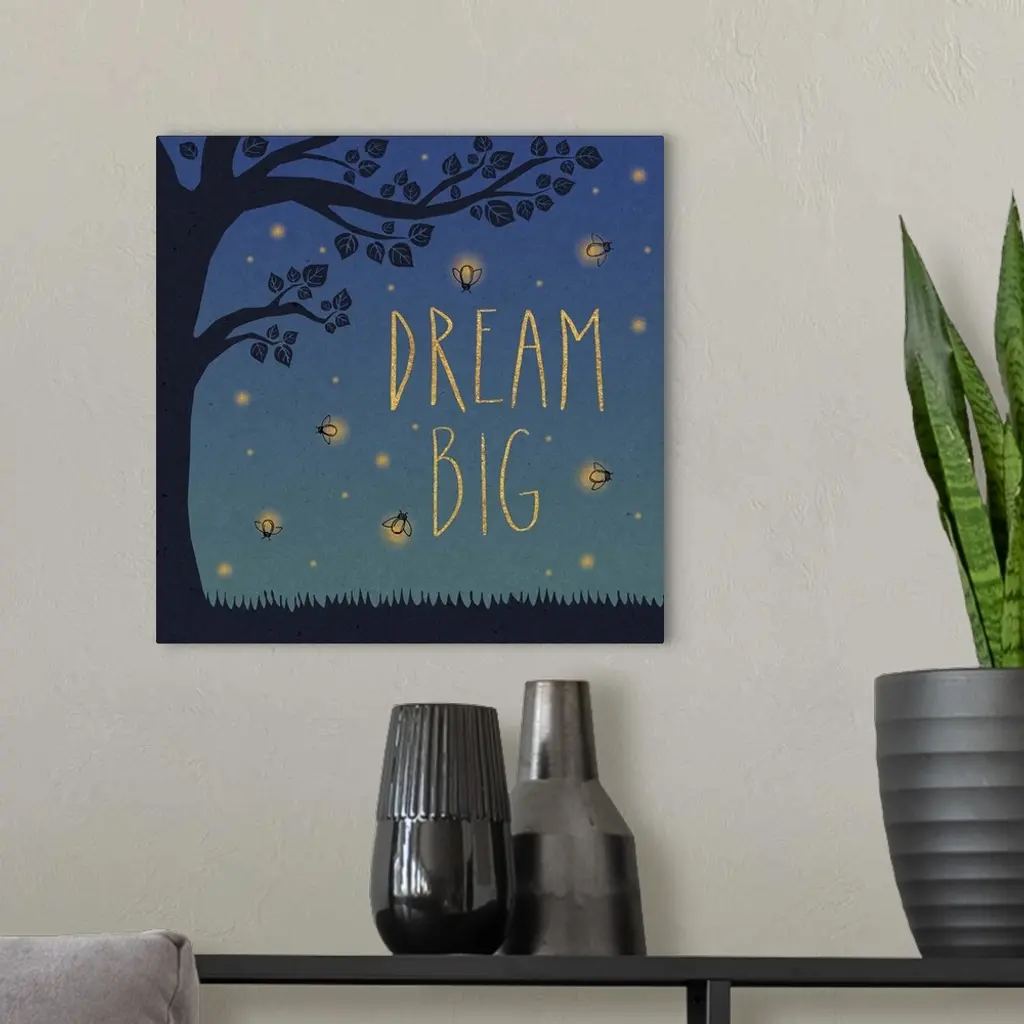 "Dream Big" in yellow letters surrounded by fireflies and a tree silhouette.