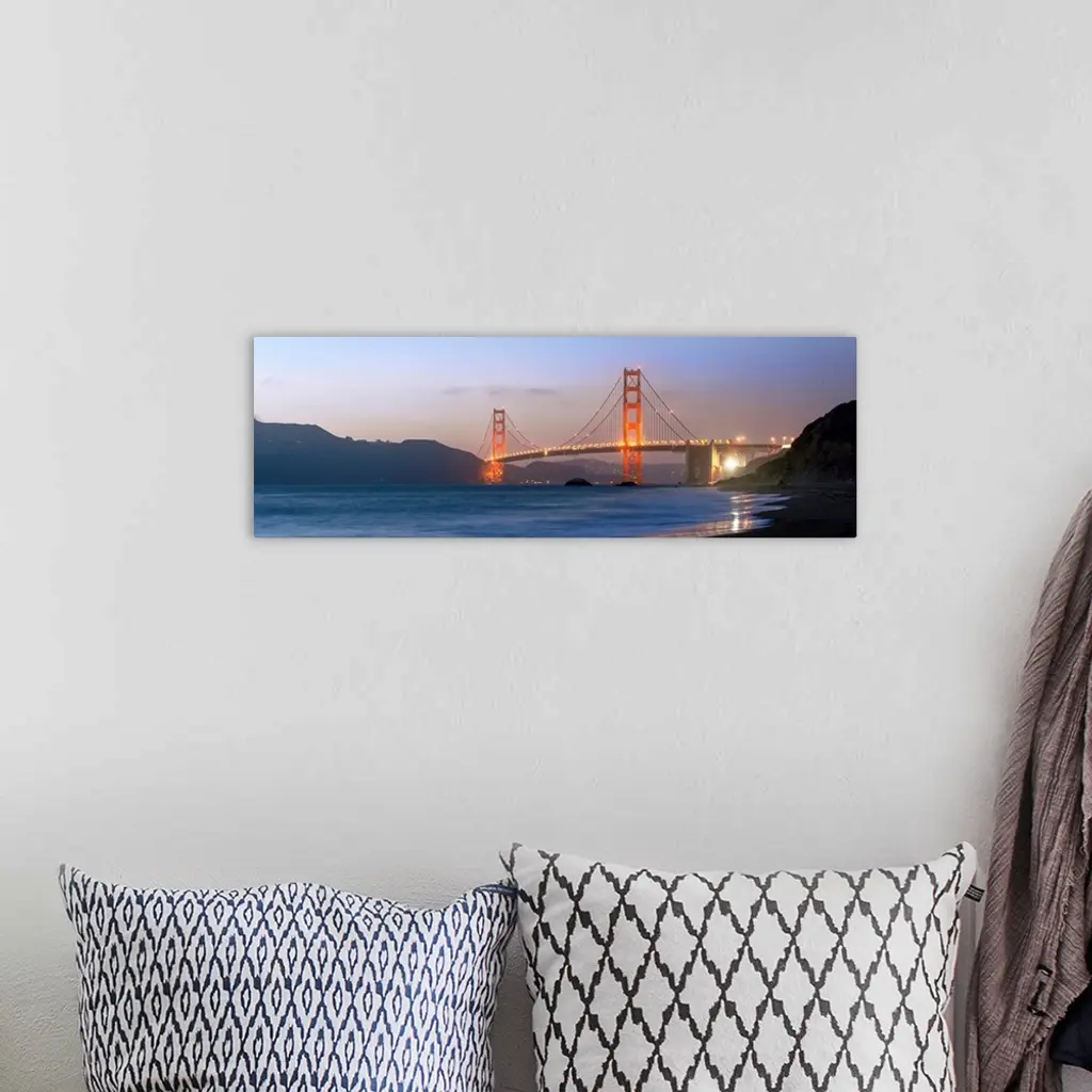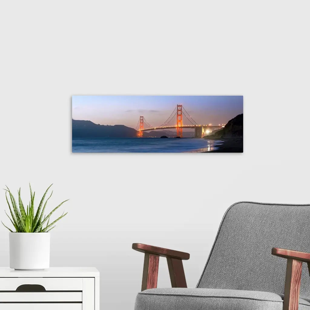 Panoramic photograph at twilight of the Golden Gate Bridge taken from the shore.