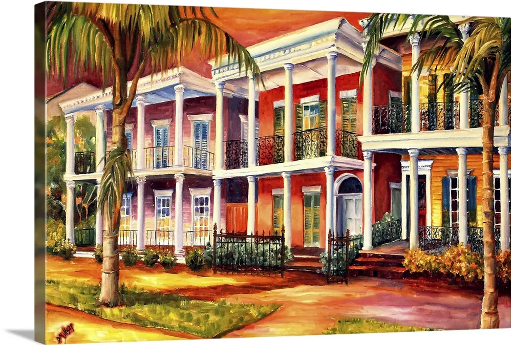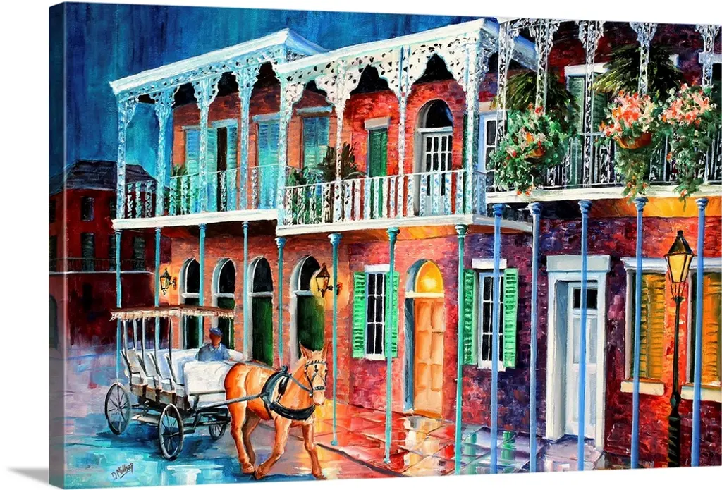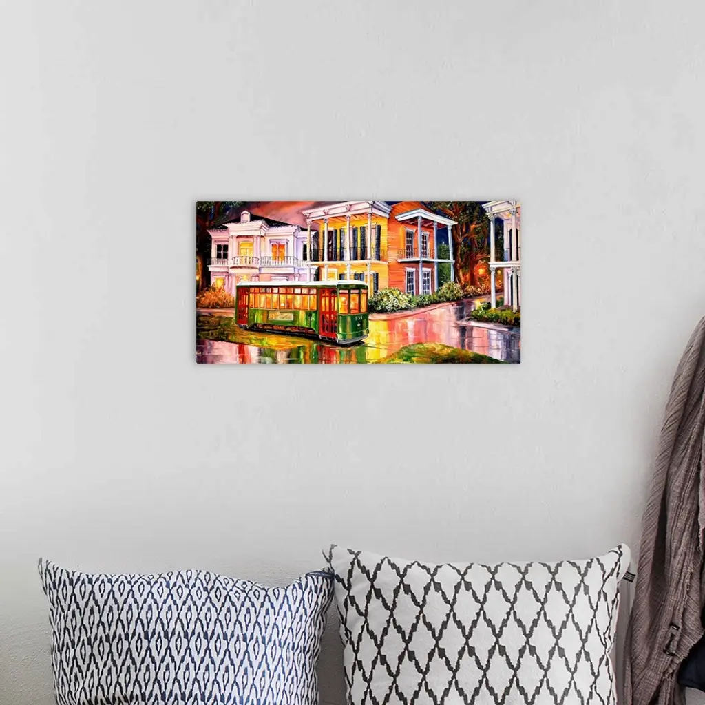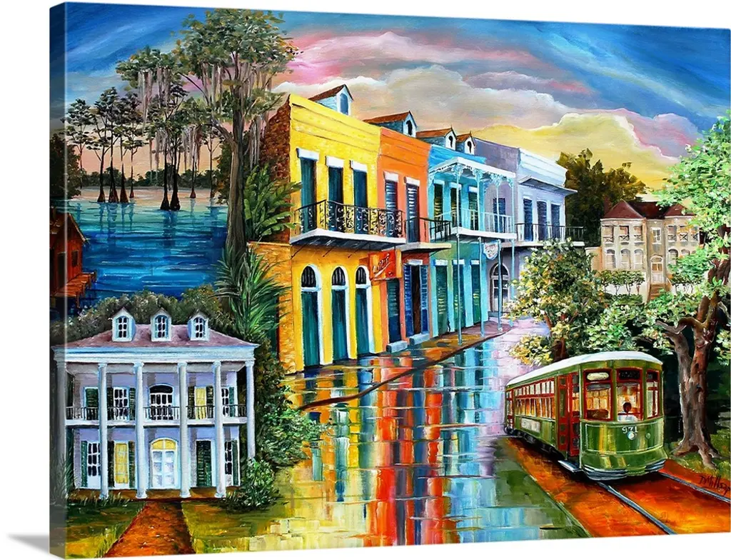 Bright colors are used to paint vintage homes on a street that appears wet as the homes and a trolley reflect in it.