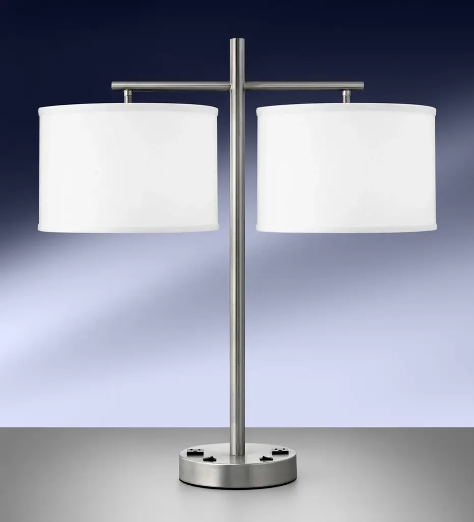 Standard Lamp Specifications for #WL2806:Product Type: Twin-light Double Nightstand LampHeight: 26"Finish: Brushed SteelConstruction: SteelSocket: (2) Aluminum On/Off Med. Base Type A 100W Max socket(s). (Bulb not included)Switching: (2) On/Off Rocker switch(es) located on the base.Cord: 6''5'' (from base) long black 16 gauge cord set with a 3 prong grounded plug.Electrical Outlet: (2) 3 prong grounded outlet(s).Data Port: None.USB Port: None.UL/CUL and/or ETL listed: YesStandard Packing: 2 per carton (shade packed separately).Lamps & Shades per SKU: 1Lamping: (2) Aluminum On/Off Med. Base Type A 100W Max socket(s).Shade Size and Description: White fabric laminated to styrene hardback drum with self fold trim measuring 10" x 10" x 7.5" w/ .5" drop (Top x Bottom x Slant).Bulb Included: NoMaterial Description: constructed from polished, plated, and lacquered steel.