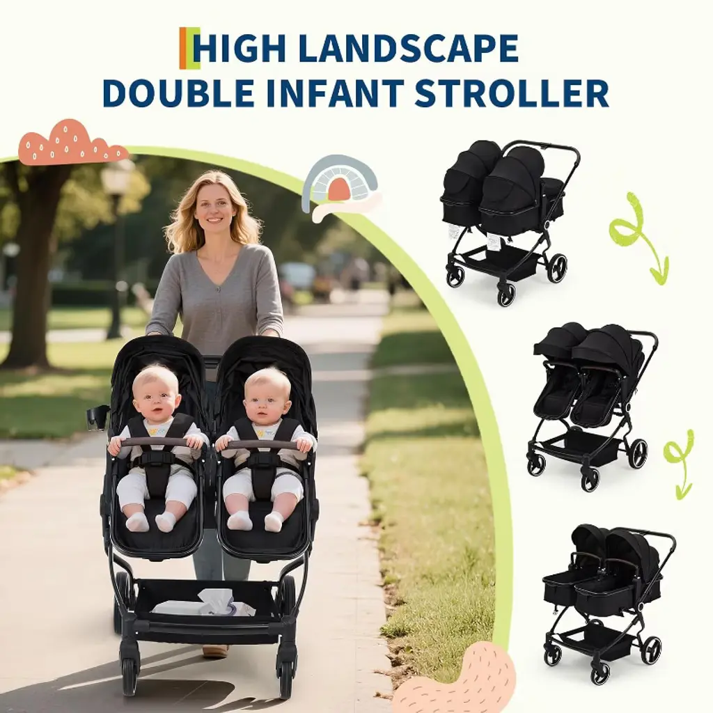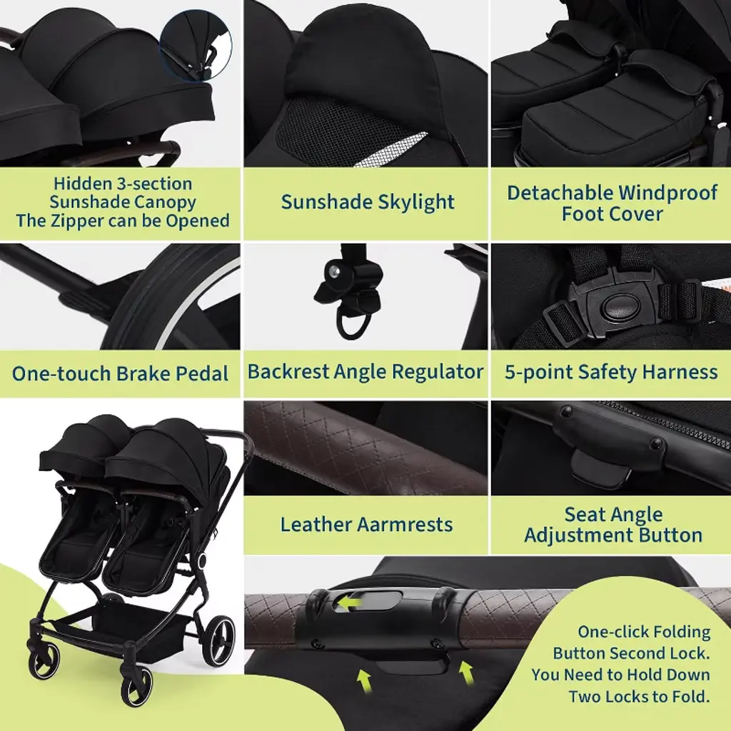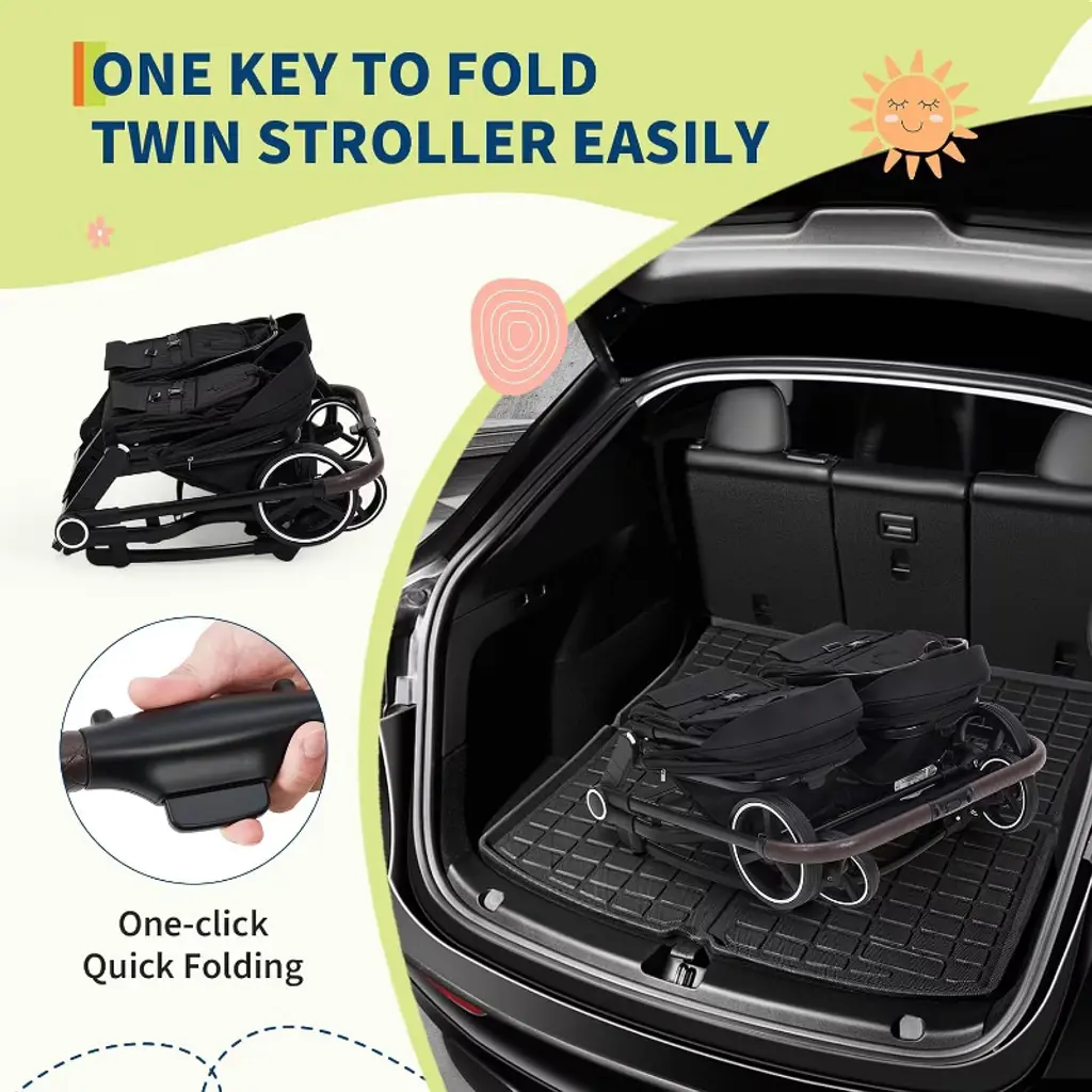 The double stroller side by side features a one-key quick folding system with a secure double lock, making storage and travel with twins or two kids a breeze. Perfect for car trips, vacations, or everyday outings.The high landscape design keeps children away from car exhaust while elevating their view.Ideal for growing twins or siblings with different needs.