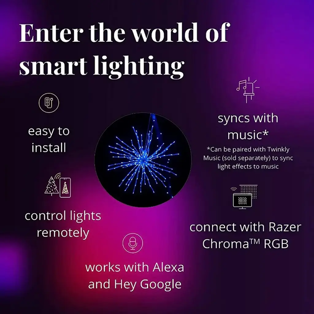 Add a sparkling glow to your space with smart LED lights Twinkly Spritzer. Whether you're decorating for summer parties, adding a Christmas tree topper, ringing in the New Year, or want to add fun lighting to your outdoor spaces, create just the right vibe with these sparklers. These premium, app-controlled, addressable LEDs were designed for extraordinary brightness and color quality in over 16 million colors. Perfect for use both indoors and outdoors.