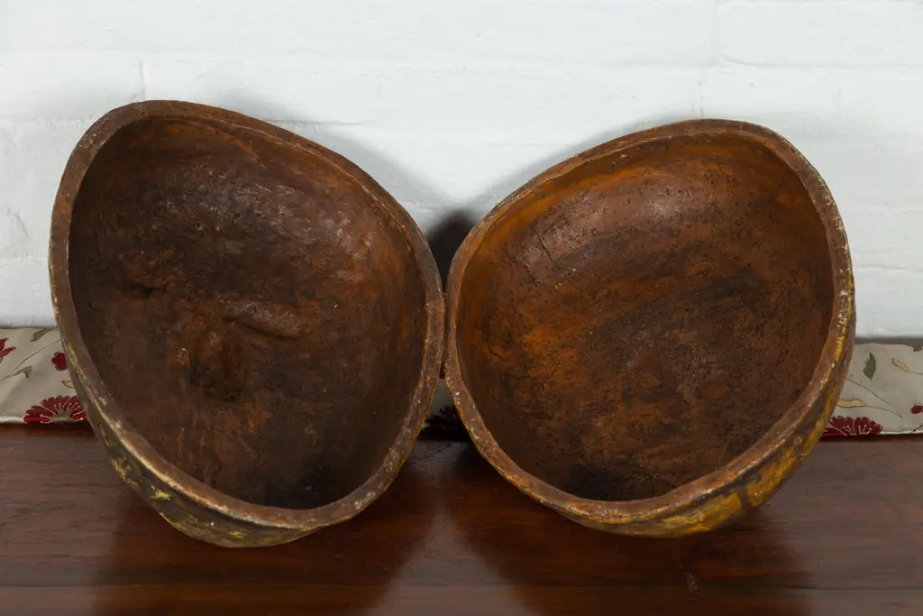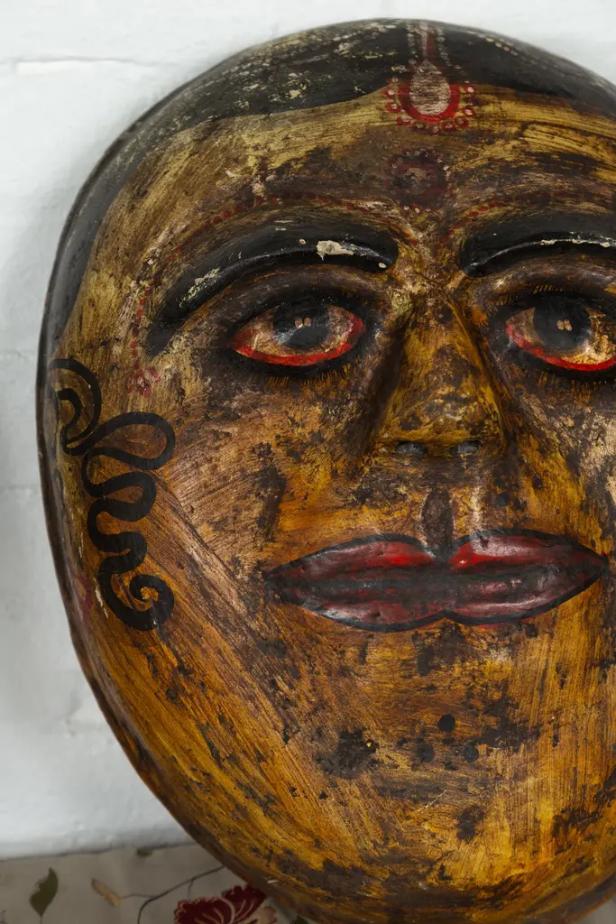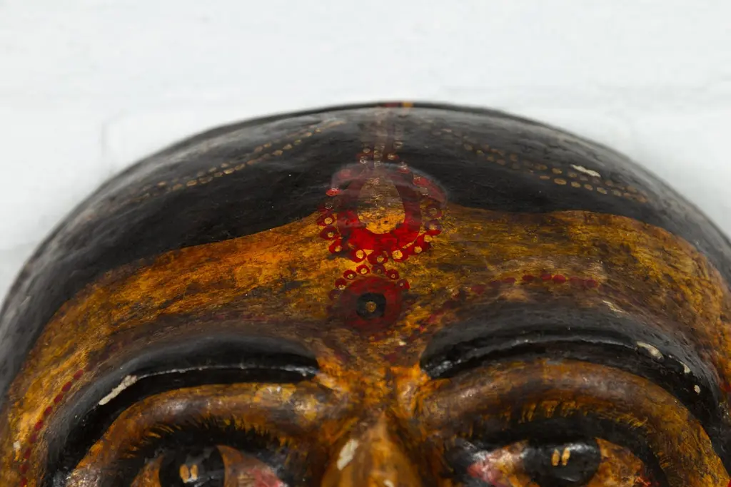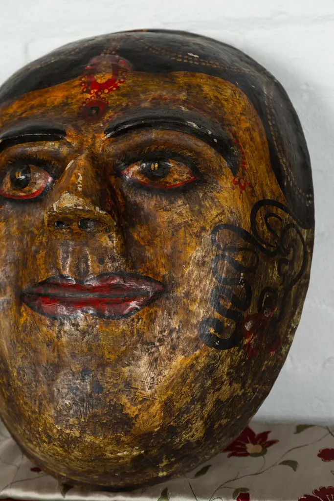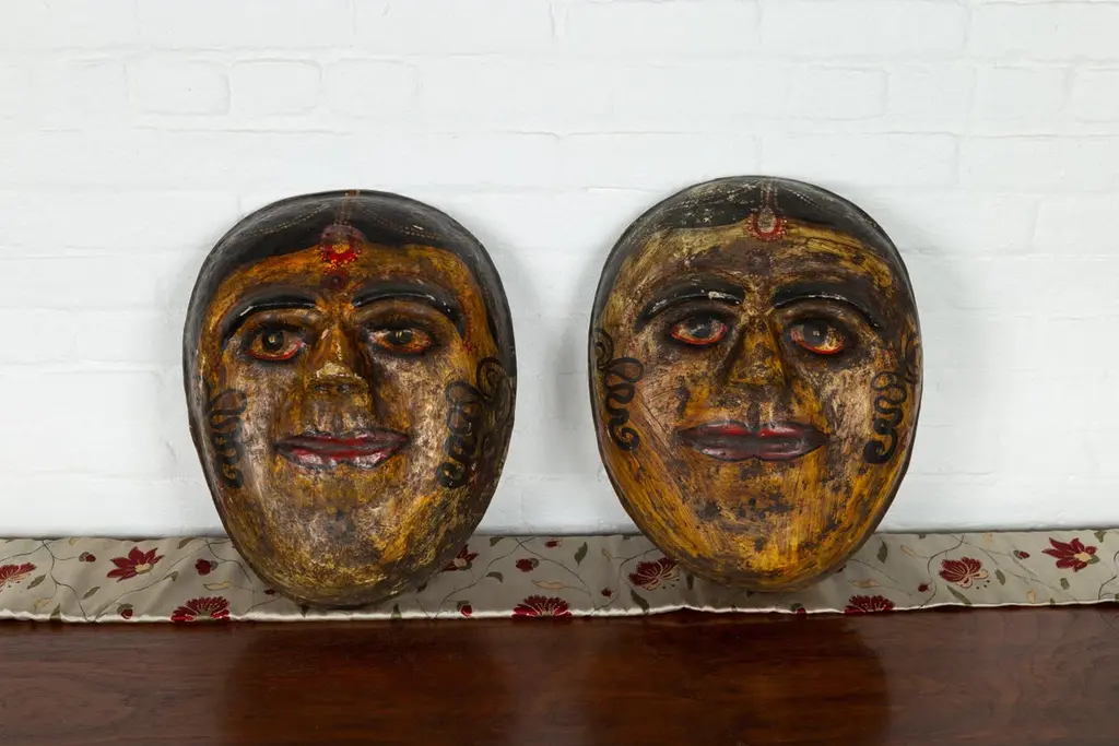 Two antique Indian papier-mâché hand painted face masks from the early 20th century, depicting Indian brides. They are priced and sold individually. Featuring a polychrome finish made of ocher, red and black tones, each of these face masks depicts an Indian bride. Touching us with the simplicity of their execution, they showcase traditional red jewels adorning the brides' foreheads and curly strings of hair on the cheeks. The eyebrows, mouths and noses are represented in an archaic manner that gives great presence to the ensemble. With their fascinating décor and small proportions, these Indian papier-mâché face masks will be undeniable conversation starters in a home. They are priced $495 each.