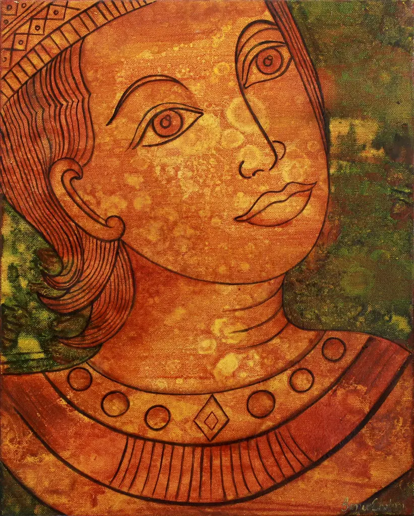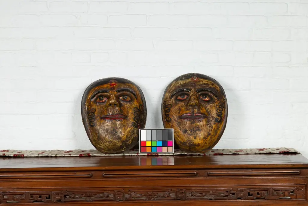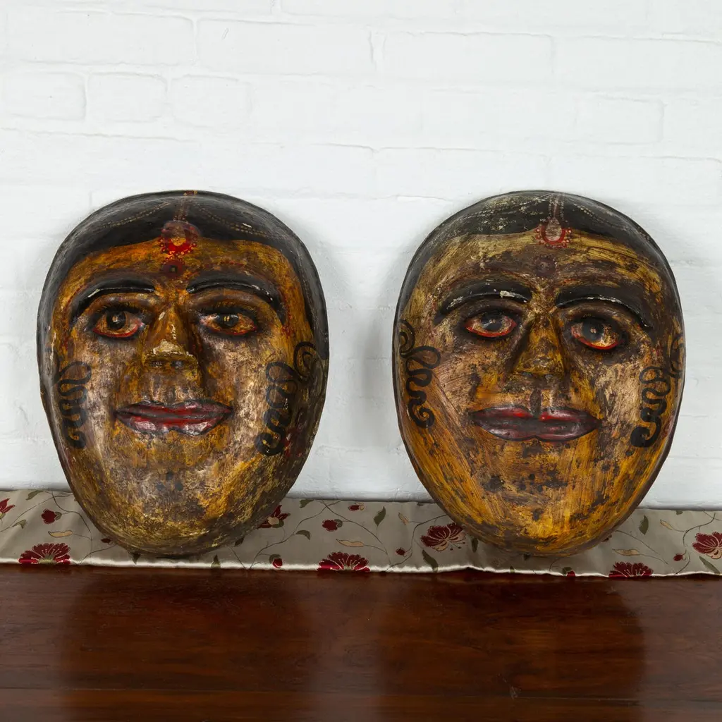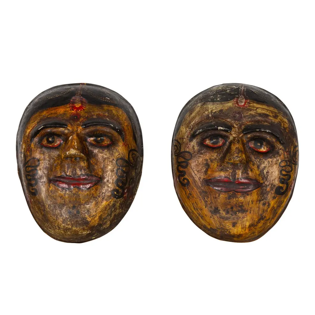 Two Antique Indian Papier-Mâché Hand Painted Face Masks Depicting Brides