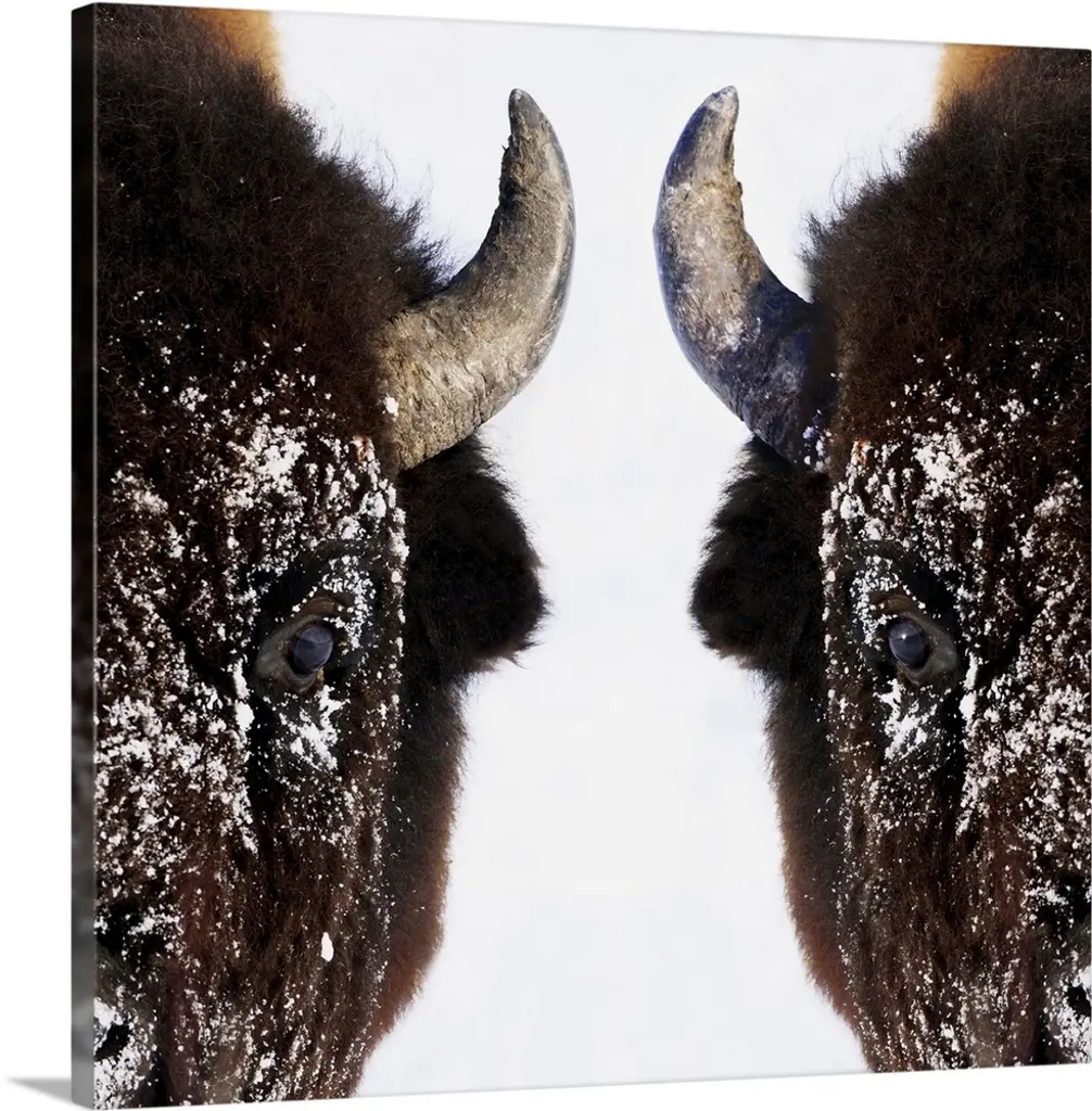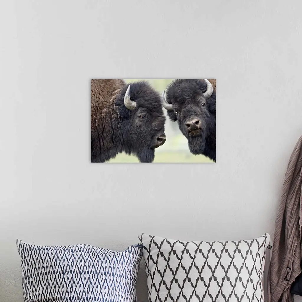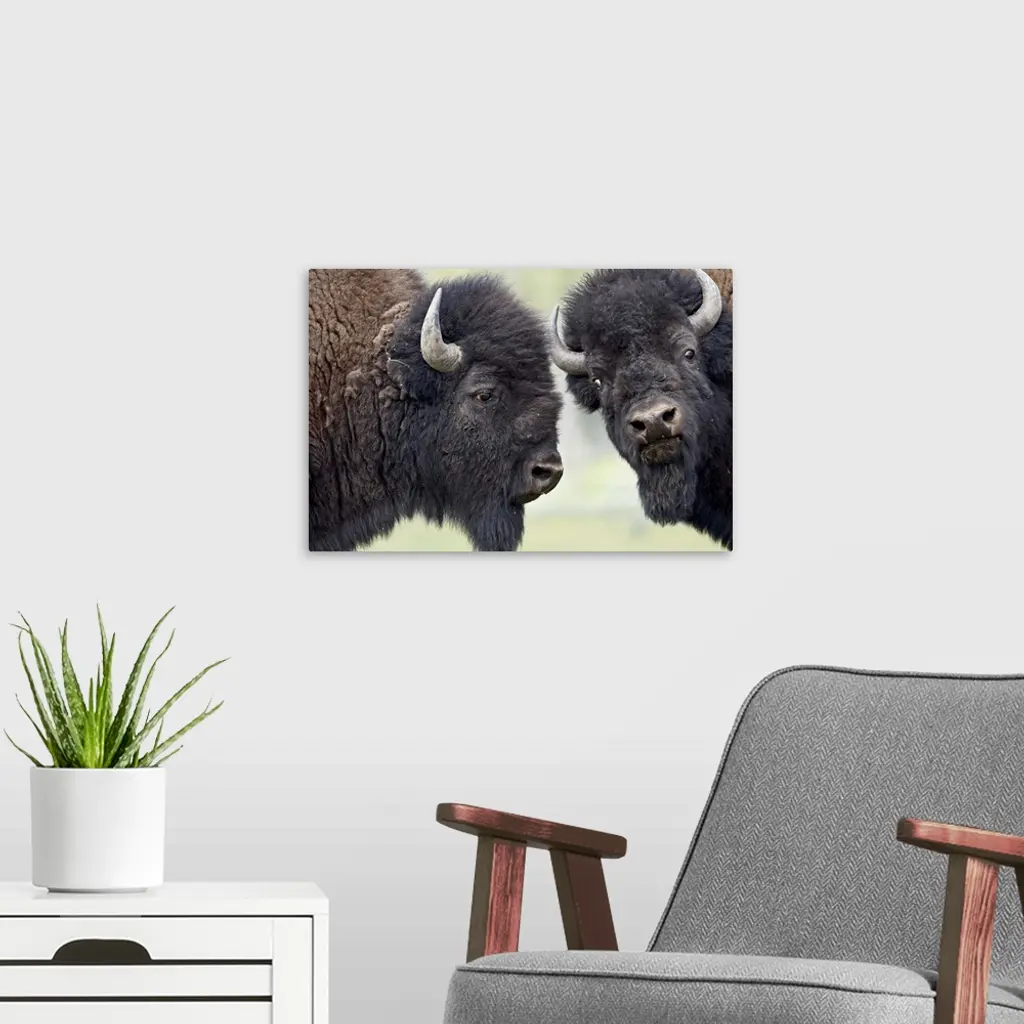 Two bison (Bison bison) bulls facing off, Yellowstone National Park, Wyoming wall art for home and office decor. Discover canvas art prints, photos, mural, big canvas art and framed wall art in GreatBigCanvas.com's varied collections.