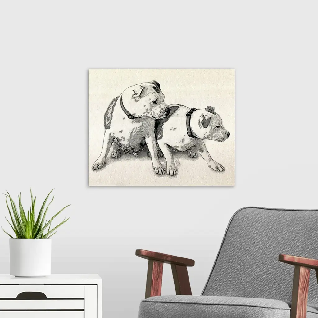 The Staffordshire Bull Terrier (also known as a Staffie, Stafford, Staffross, Staffy or Staff) is a medium-sized, short-coated, old-time breed of dog noted for its stocky, muscular appearance. The Staffordshire Bull Terrier breed originated in England, and is related to the bull terrier and similar in appearance to the much larger American Staffordshire terrier and American pit bull terrier. Due to its breeding, the Staffordshire is known for its character of indomitable courage, high intelligence, and tenacity. This, coupled with its affection for its friends, its off-duty quietness and trustworthy stability, make it a foremost all-purpose dog. It has been said that No breed is more loving with its family