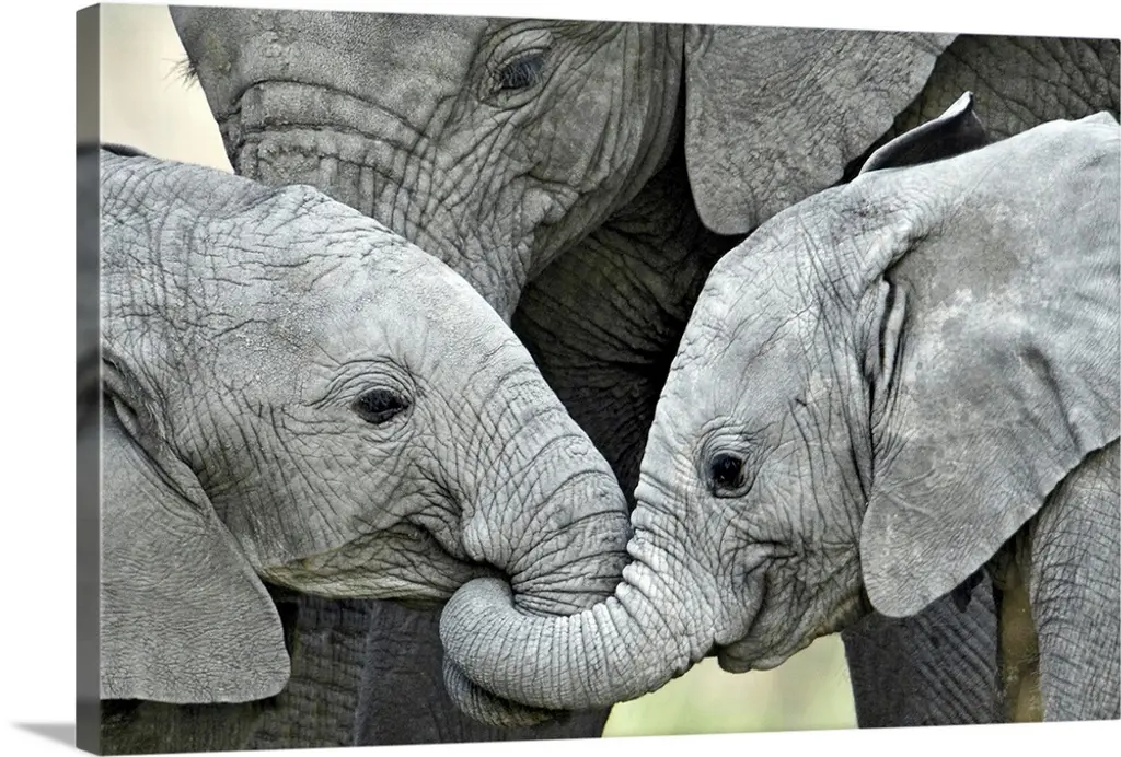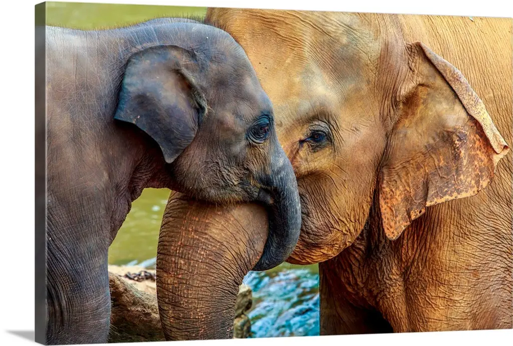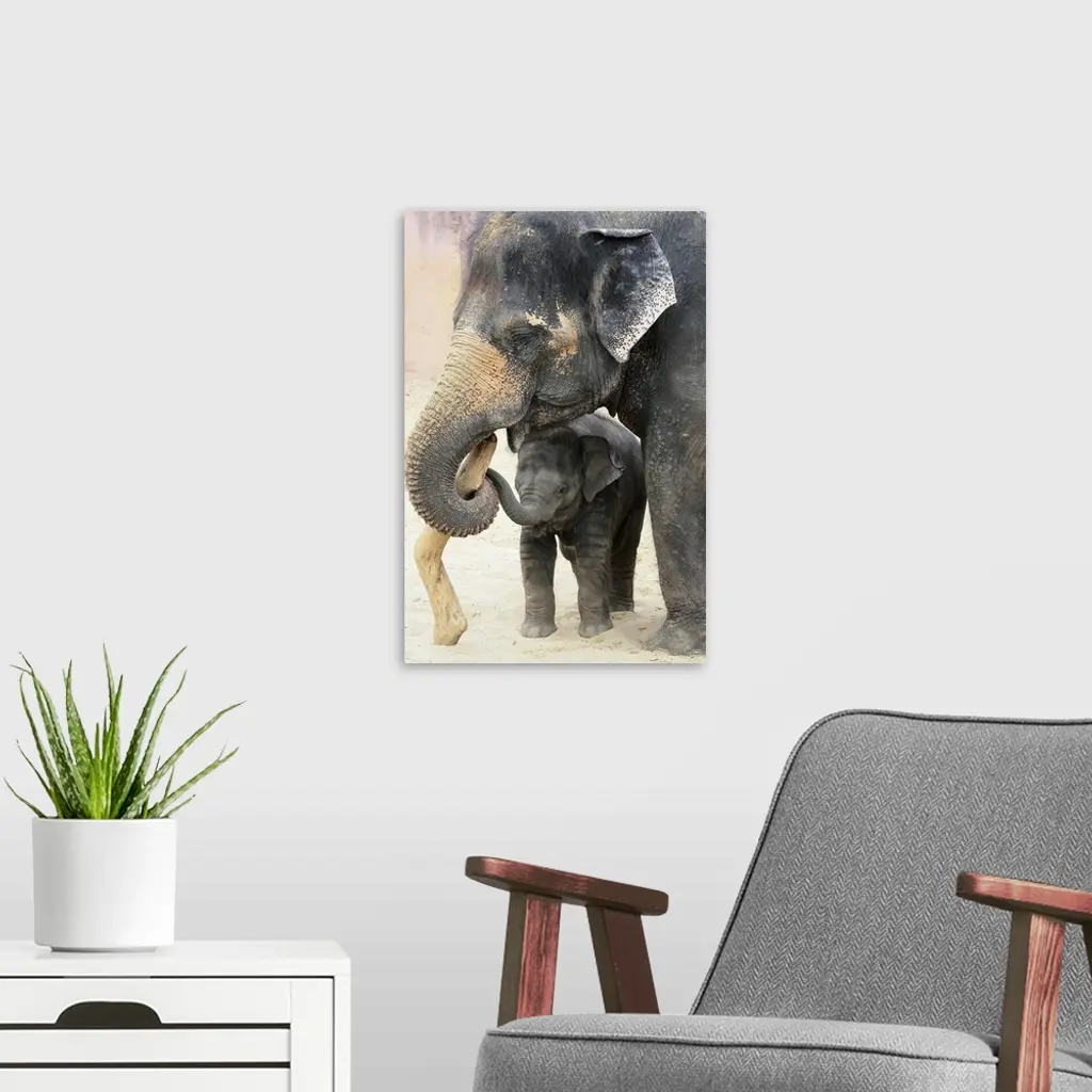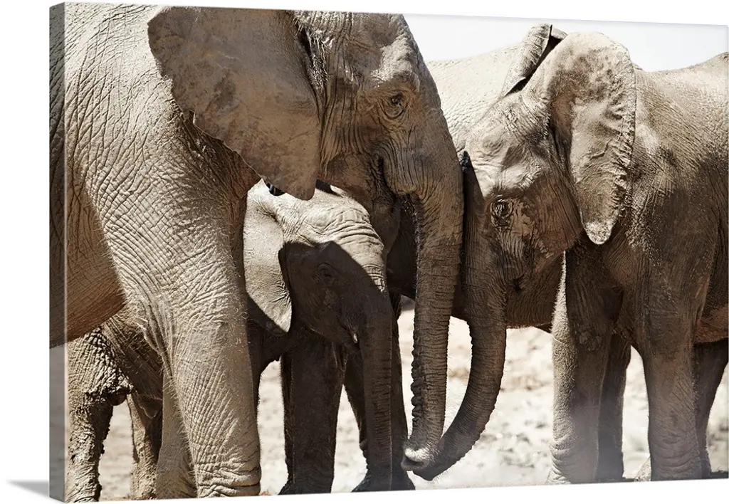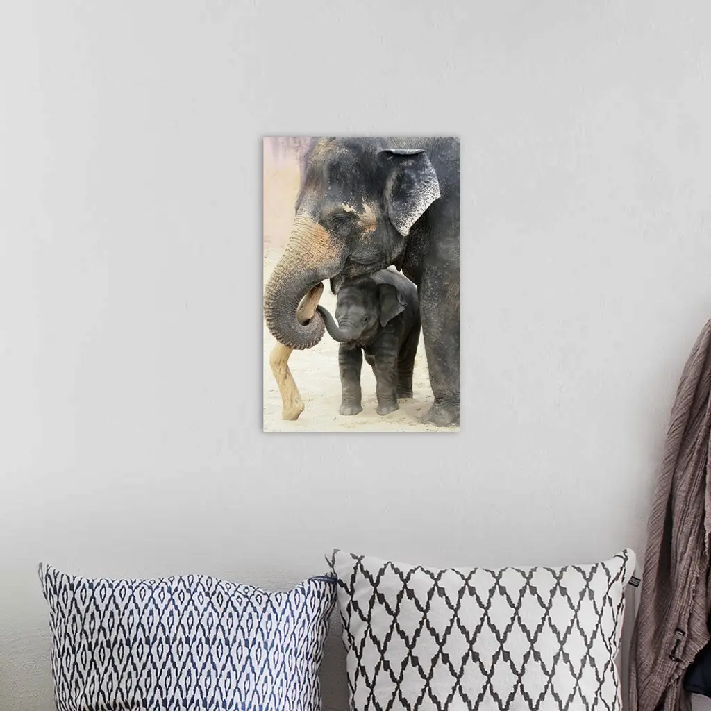 Wildlife photograph of a dirty elephant and its baby playing with a stick in the sand.