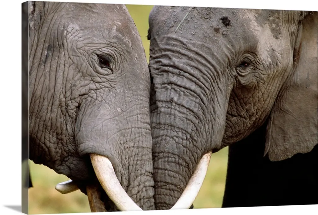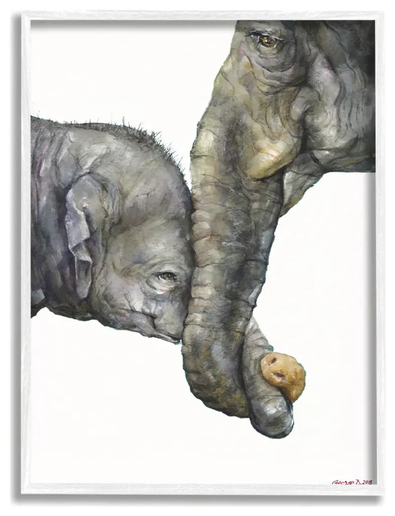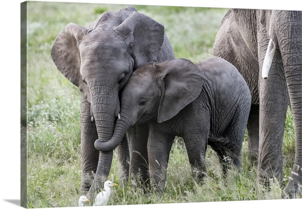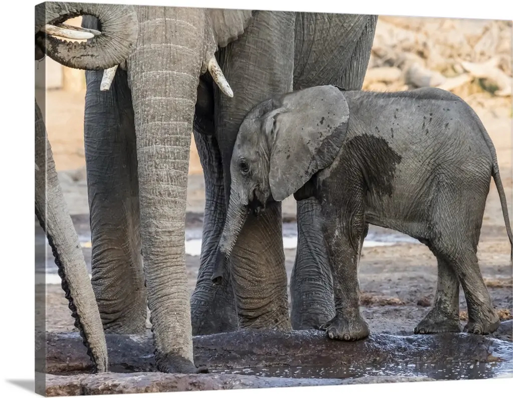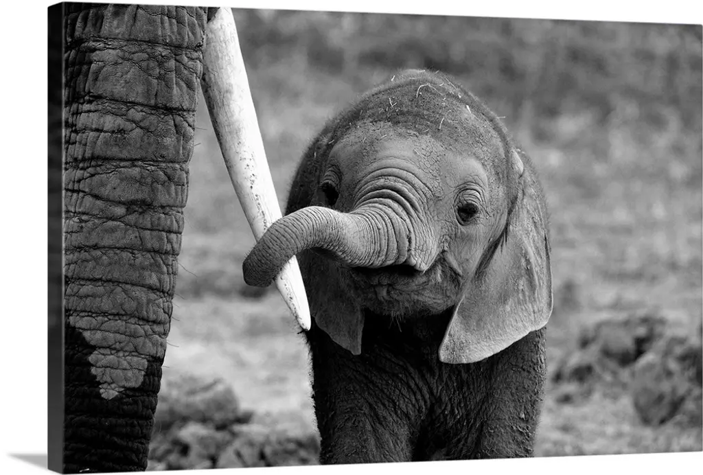 Wildlife photograph of a dirty elephant and its baby playing with a stick in the sand.