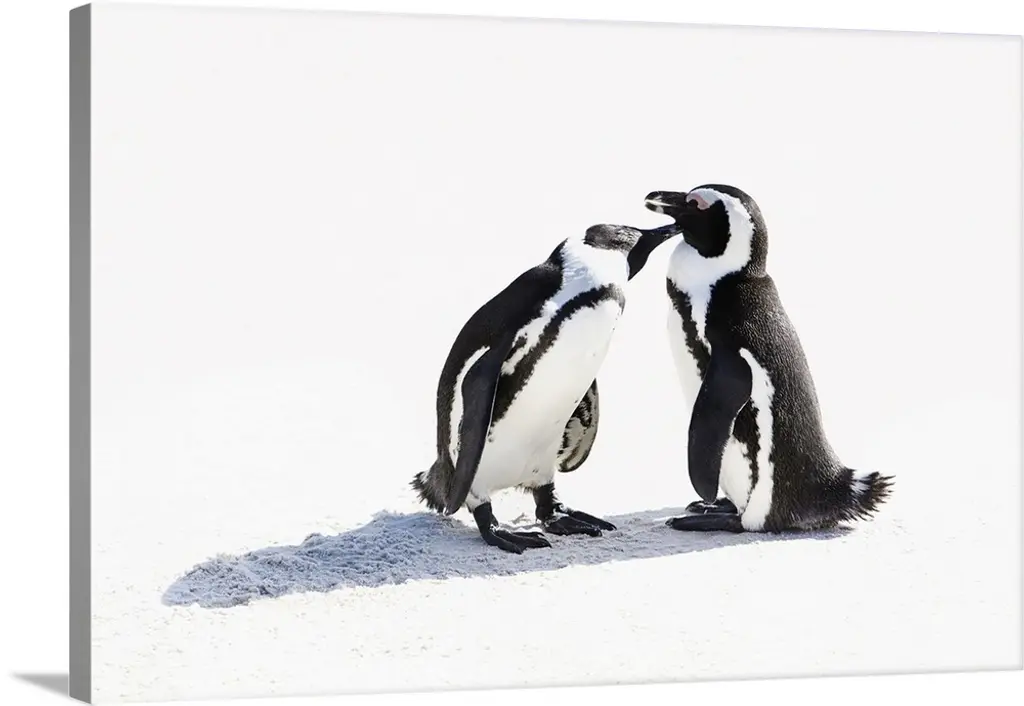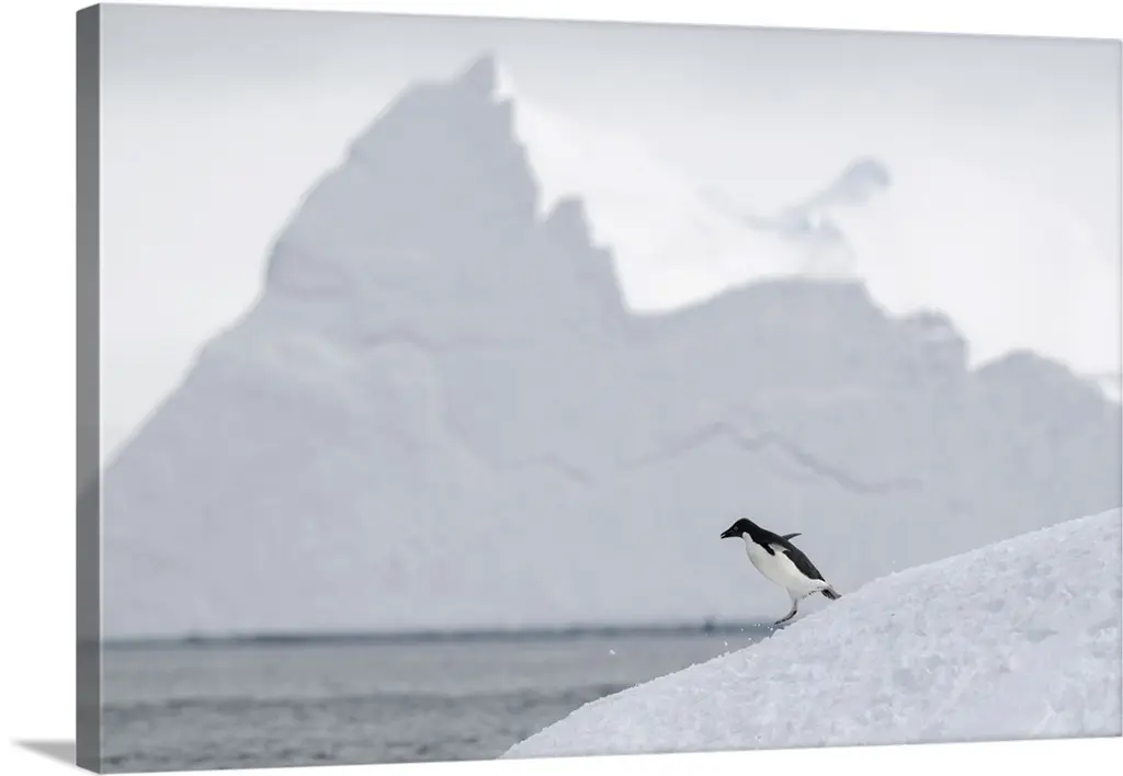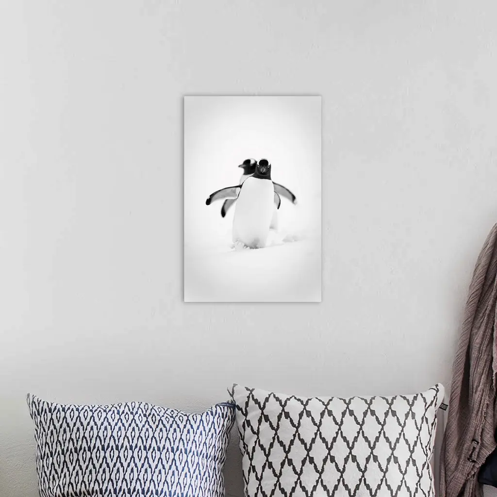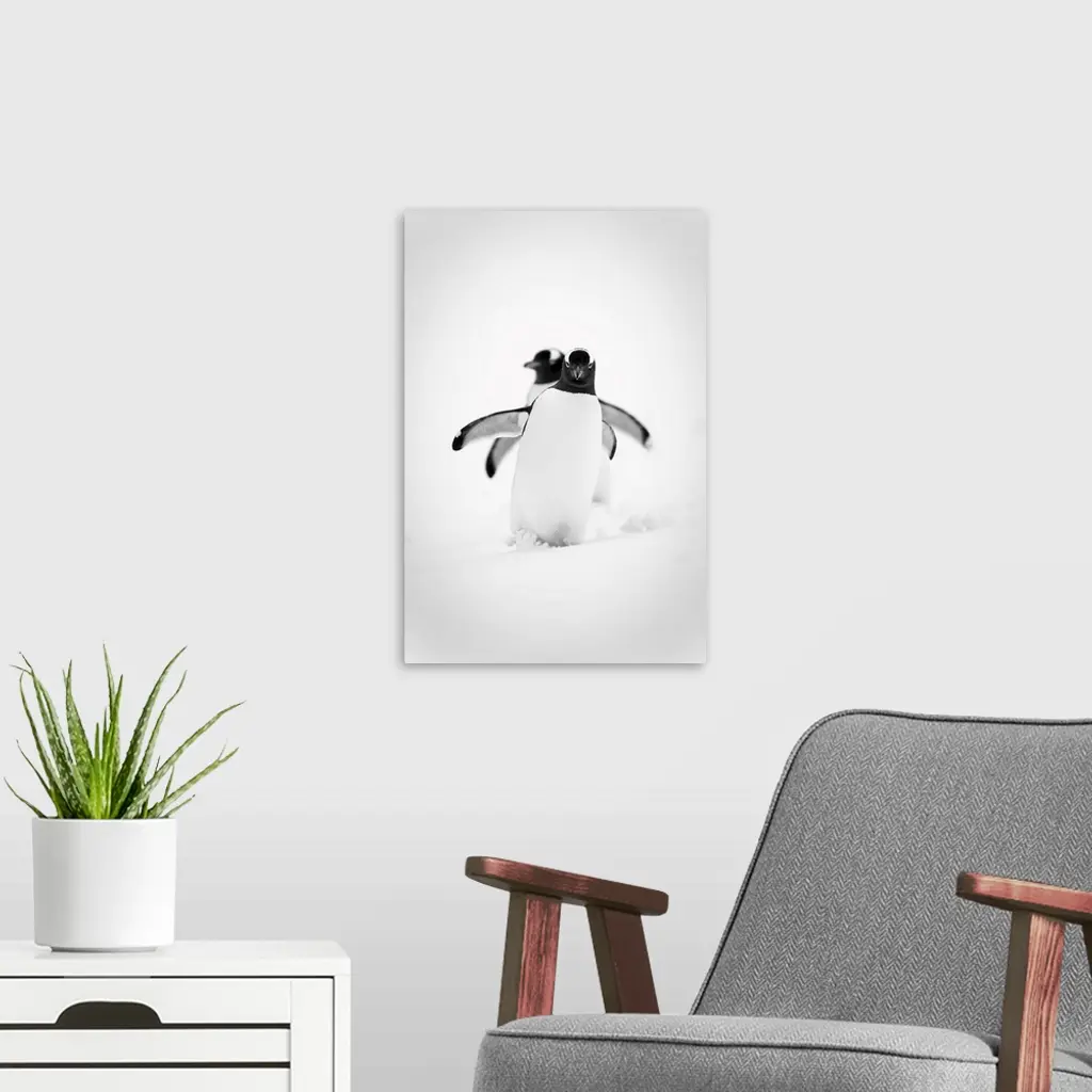 Monochrome image of two gentoo penguins (pygoscelis papua) waddling in line across a snowy slope, holding their flippers out for balance. Each one has a white chest, and black and white head. Image taken on danco island off the antarctic peninsula in december 2021, antarctica.