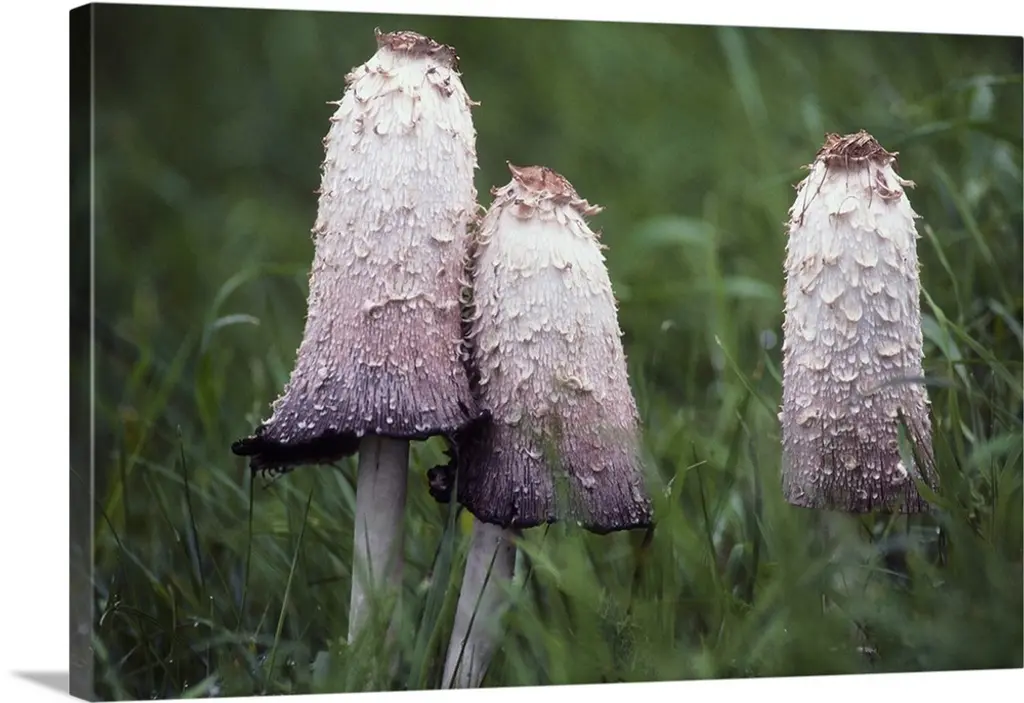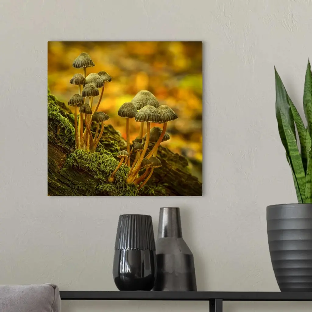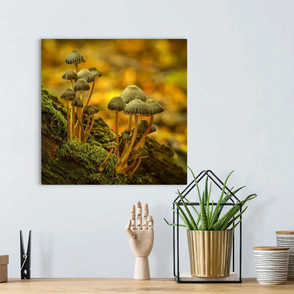 Two clusters of little mushrooms growing on a mossy log.