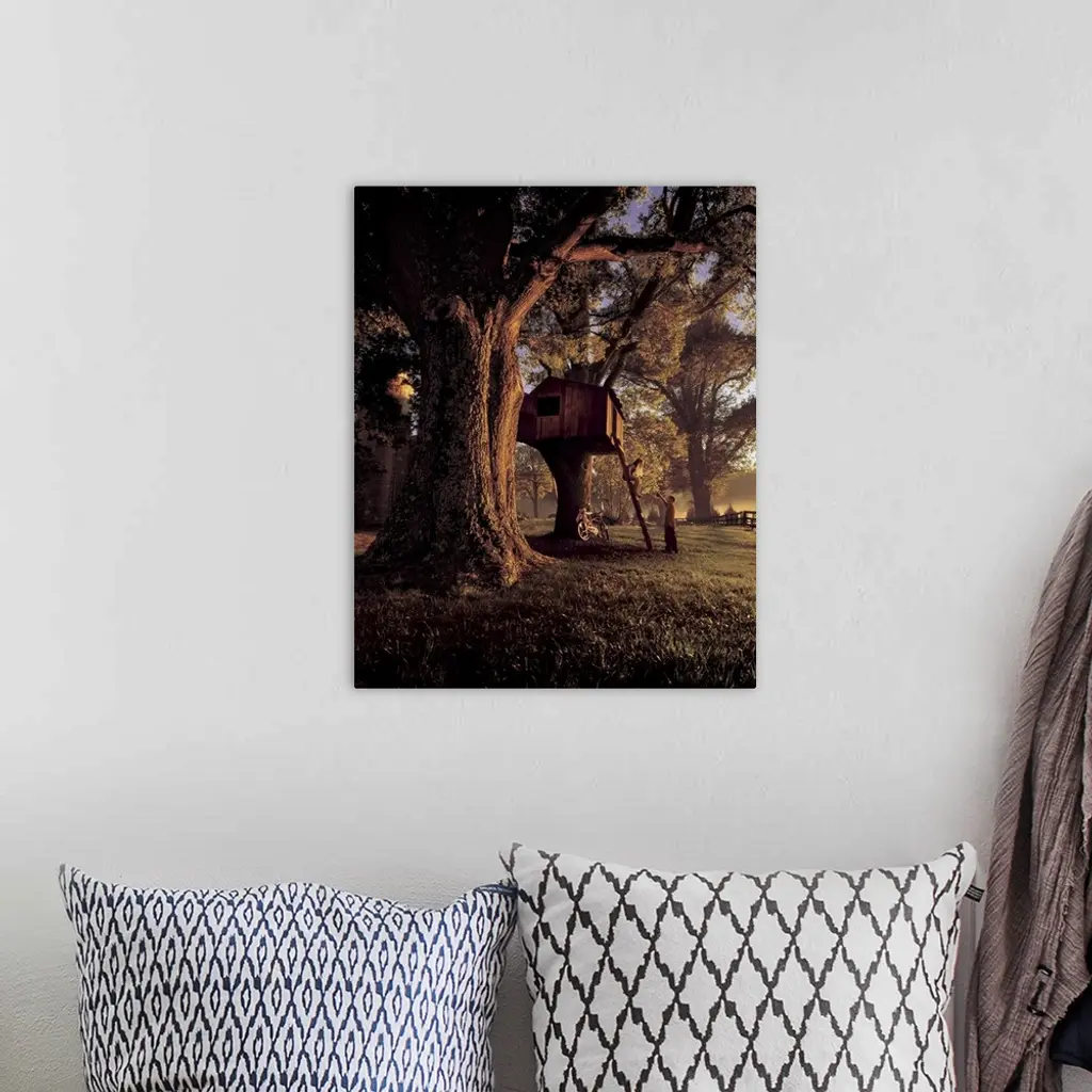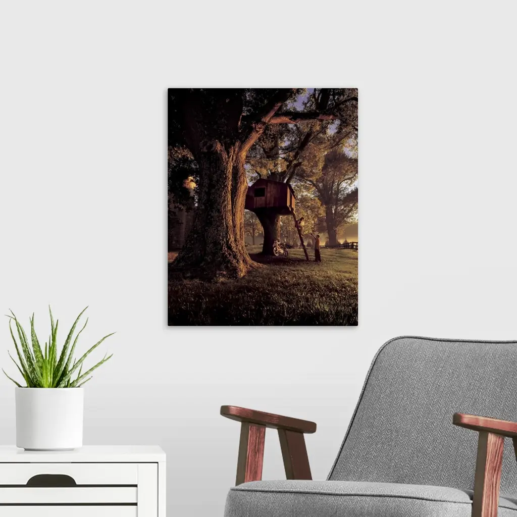 Two Kids Play On A Treehouse On A Rural Farm In North Carolina