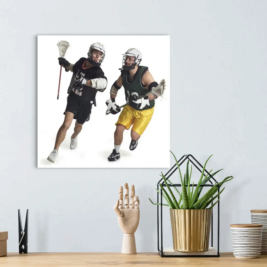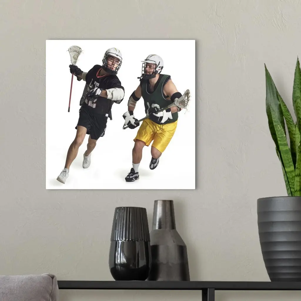 Two Male Lacrosse Players From Opposite Teams Running