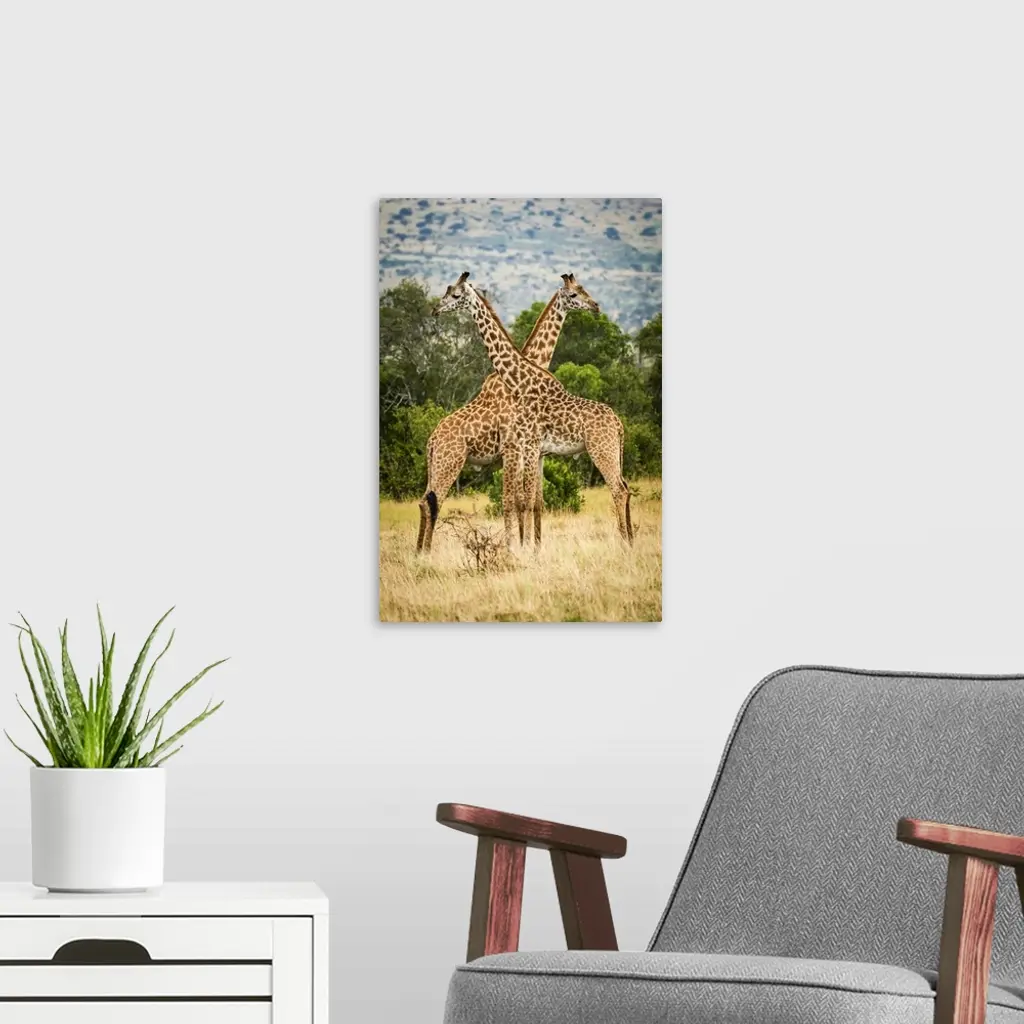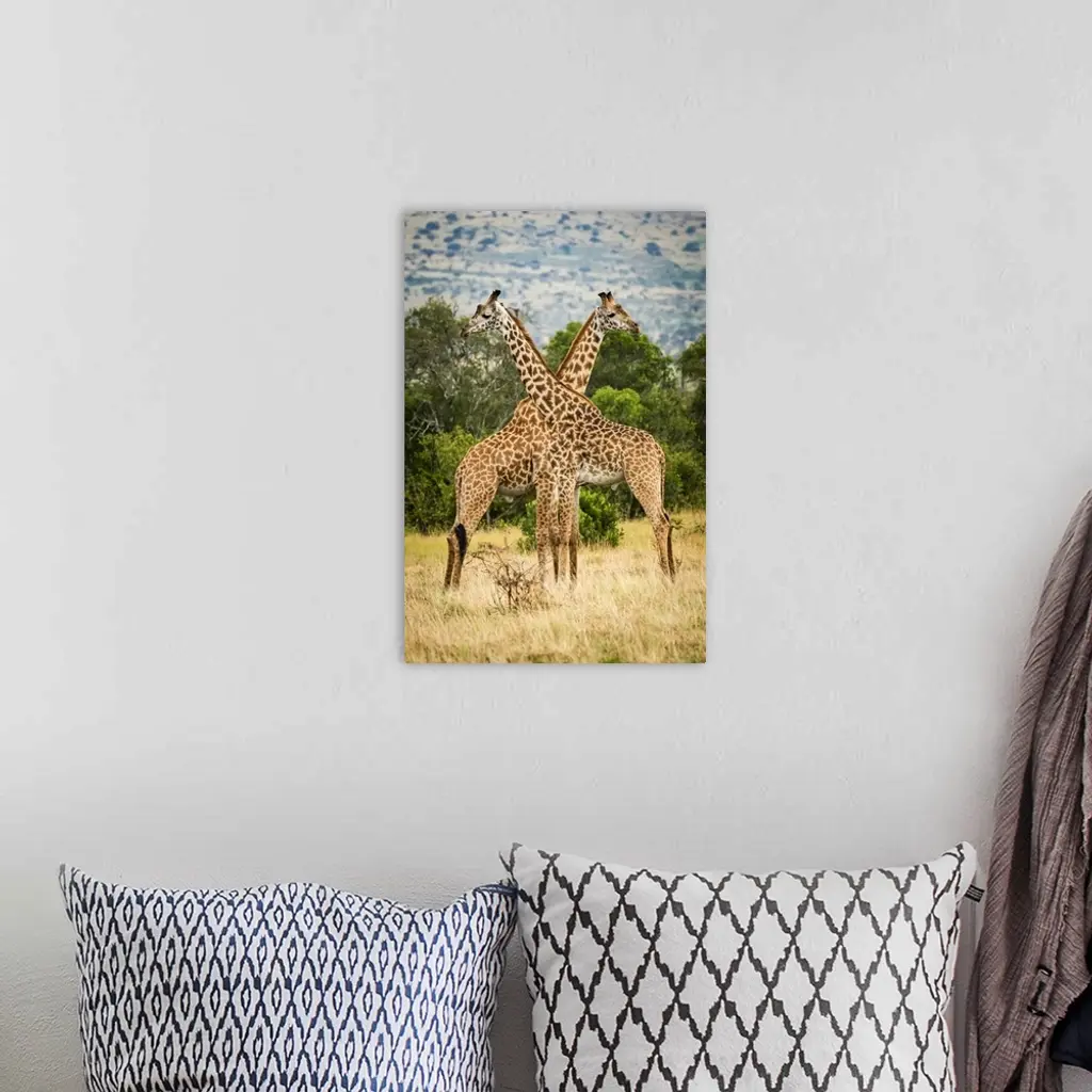 Two Masai Giraffe Crossing Necks By Trees, Serengeti, Tanzania