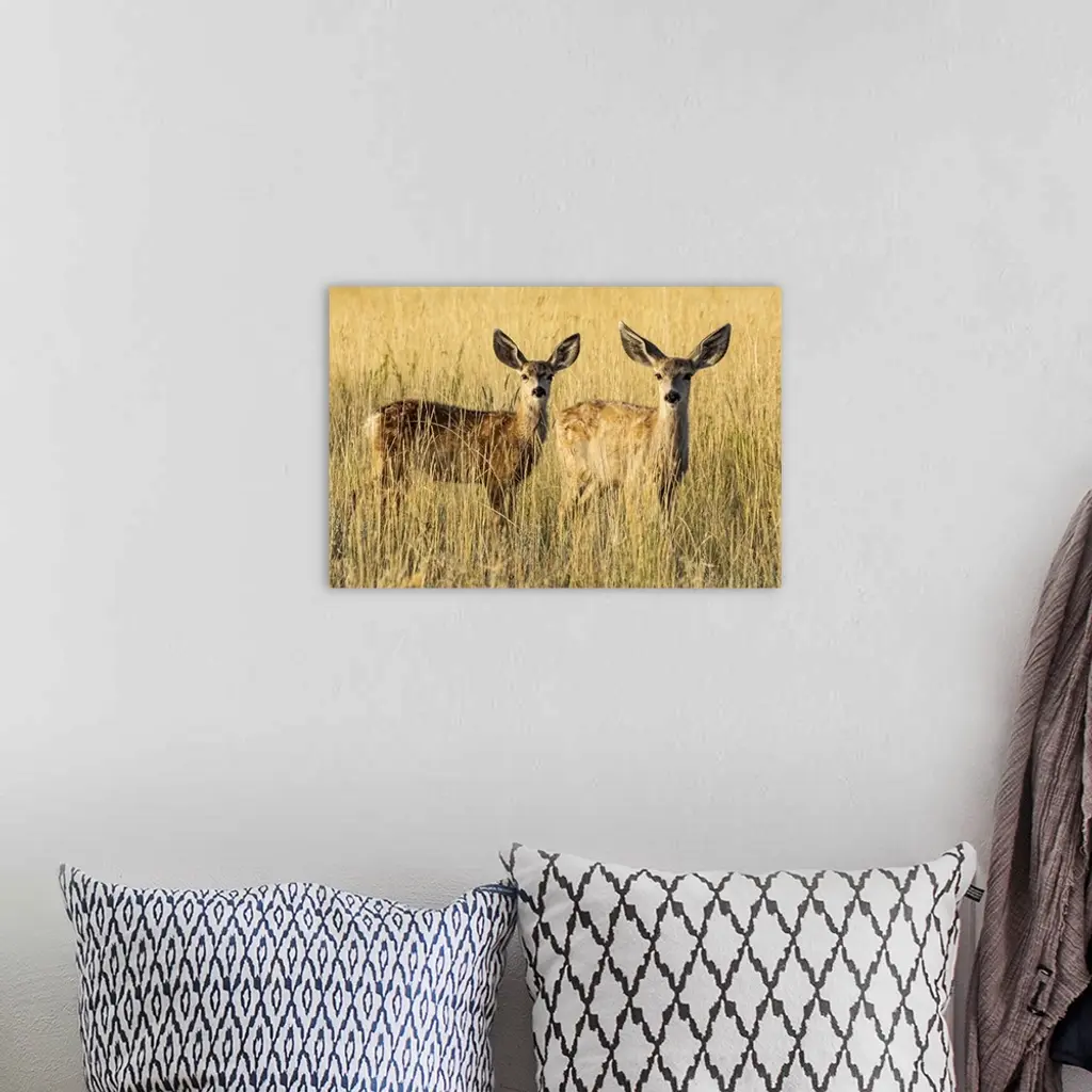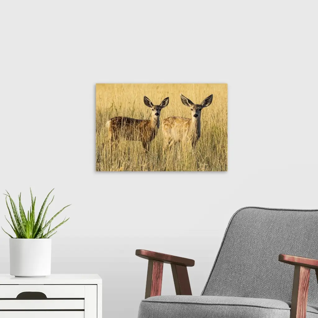 Two Mule deer fawns (Odocoileus hemionus) standing in golden grass; Steamboat Springs, Colorado, United States of America