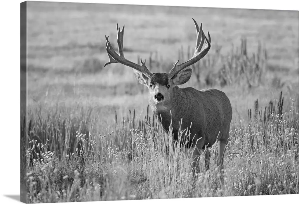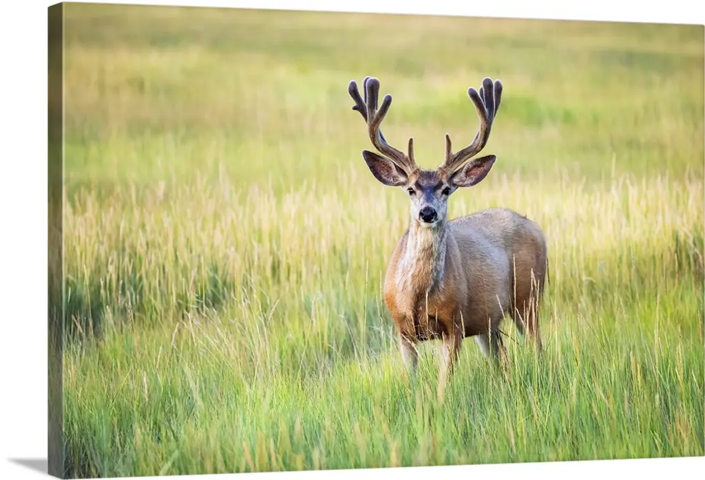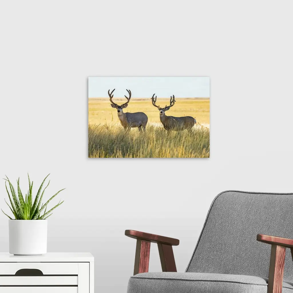 Two Mule deer bucks (Odocoileus hemionus) standing in a grass field; Steamboat Springs, Colorado, United States of America