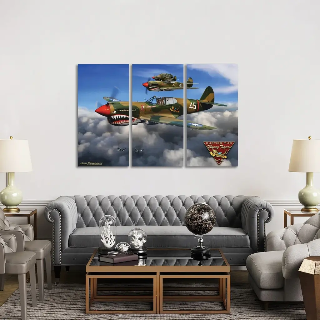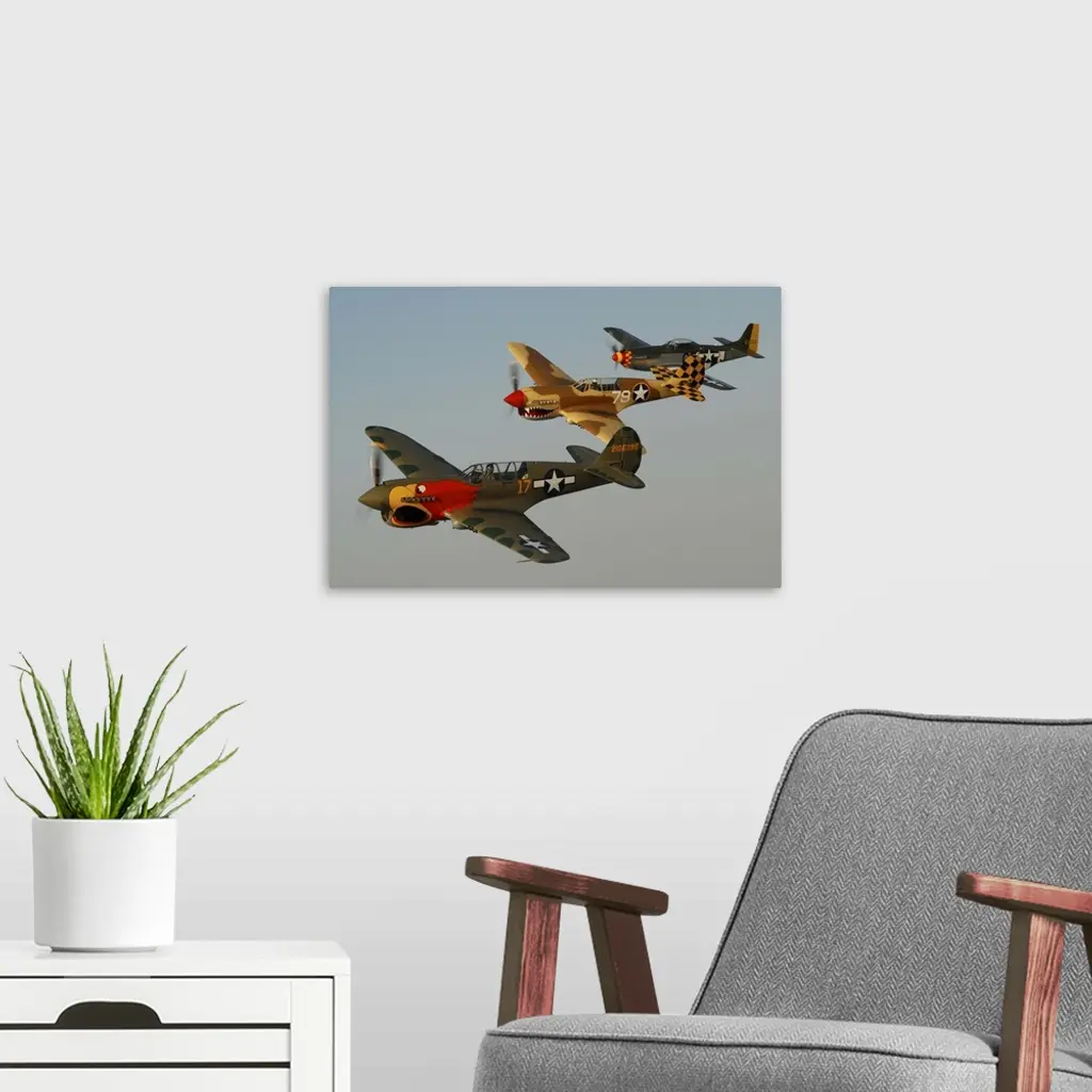 Two P-40 Warhawks and a P-51D Mustang flying over Chino, California.