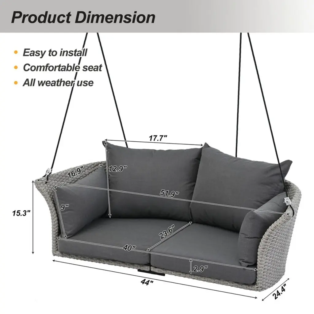 Two-person 51.9" Rattan Woven Hanging Seat With Ropes - Gray Wicker Swing Chair With Cushion
