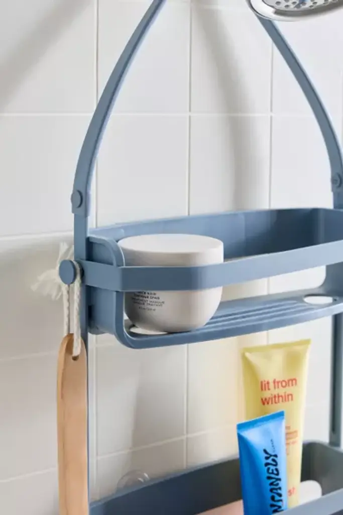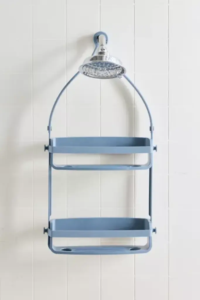 A modern shower organizer to keep your bathroom organized, this durable plastic shower shelf features a duo of tiers to accommodate your shampoo, conditioner & body wash bottles. This shower caddy includes four hooks to store your razors and an integrated draining system to keep your caddy fresh. **Features** \- Two-Tier Plastic Flex Shower Caddy \- Modern shower organizer \- Two wide shelves to hold your hair care & body wash \- Four hooks to hold your loofahs and razors \- Four bottle collars to help you get every last drop of your product \- Integrated draining system keeps your shower shelf free of mold and mildew \- Versatile hanging - mount it over your shower head or hang it on your curtain rod **Content + Care** \- 90% Recycled ABS plastic, 5% silicone, 5% TPE \- Wipe clean \- Imported **Size** \- Dimensions: 13"l x 3.9"w x 26"h \- Caddy shelf dimensions: 13"l x 3.9"w \- Weight limit: 5 lbs \- Weight: 1.2 lbs