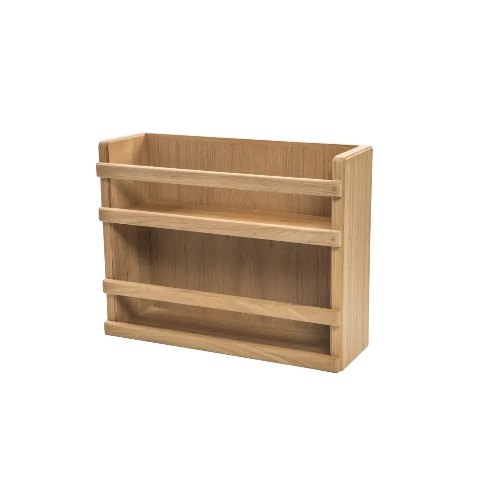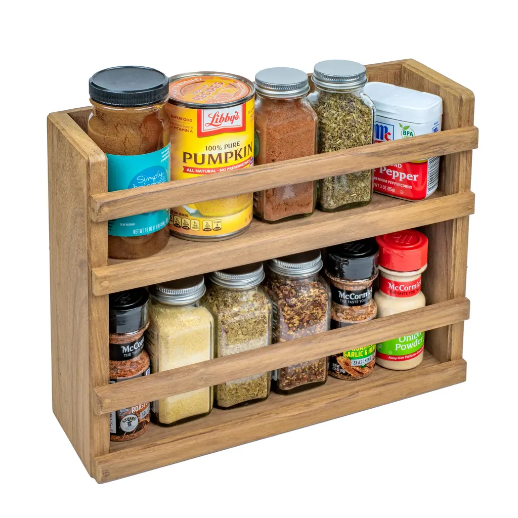 Two-Tier Spice Rack Made from solid prime aged teak, this two-tier spice rack is made to last. Can be used free standing or wall mounted. Neatly organize your spices with this spice rack.Size: 13-1/8" W x 10-1/8" H x 4-1/4" D
