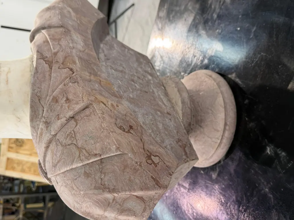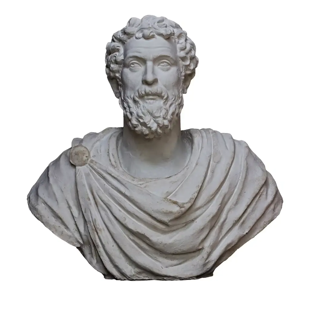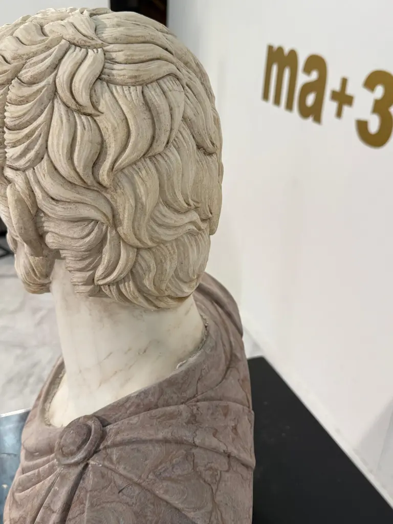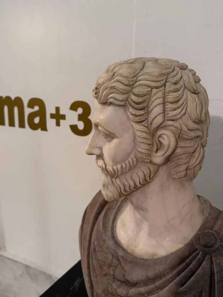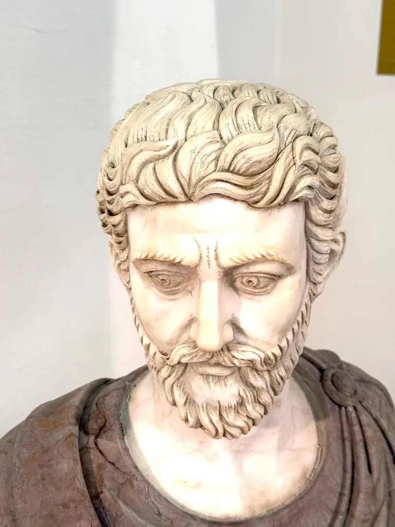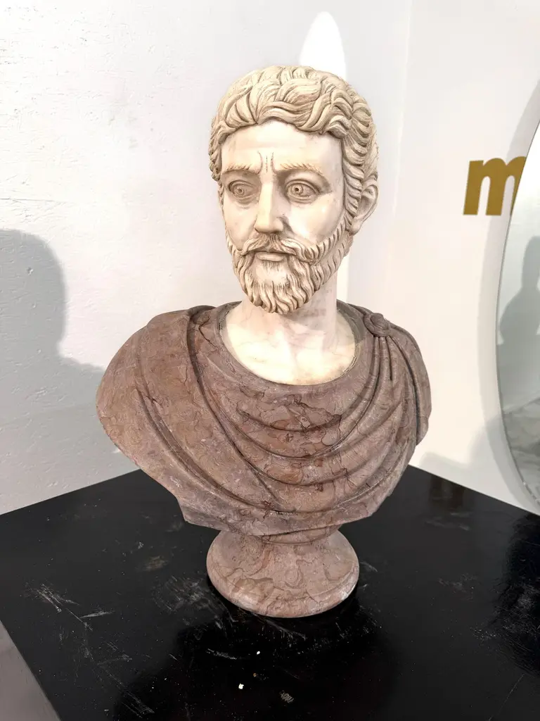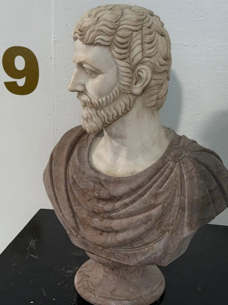 An elegant two-tone marble bust of a Roman nobleman, showcasing exceptional craftsmanship and classical refinement. The finely carved white marble head, with detailed curls and a neatly trimmed beard, conveys a sense of wisdom and quiet authority. The contrasting warm-toned marble toga drapes naturally across the shoulders, adding depth and richness to the composition. Resting on a rounded marble pedestal, this bust embodies the timeless grandeur of Roman portraiture, making it an ideal focal point for interiors that appreciate classical elegance and historical artistry. Its subtle veining and smooth polish highlight the natural beauty of the stone, enhancing its presence and sophistication.