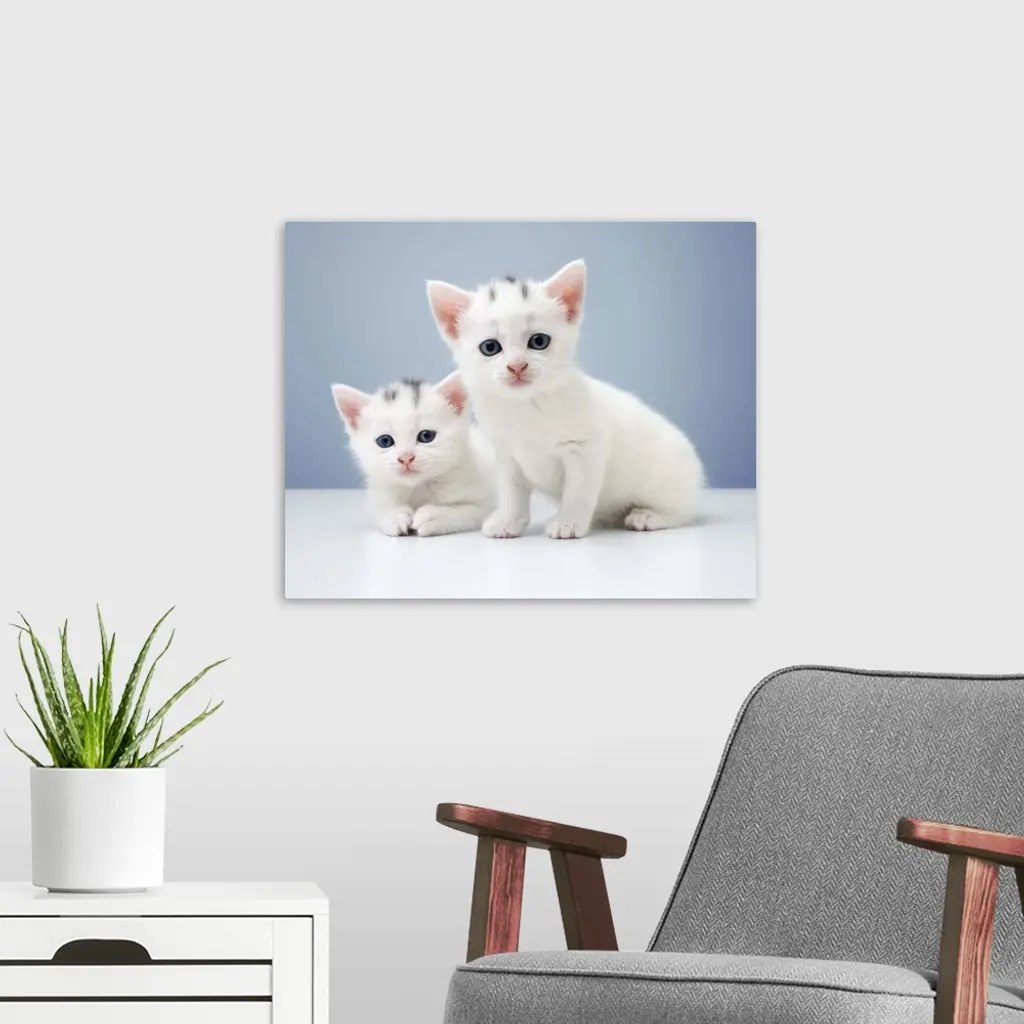 Two very young white kittens stare inquisitively at the camera full of mischief and curiosity